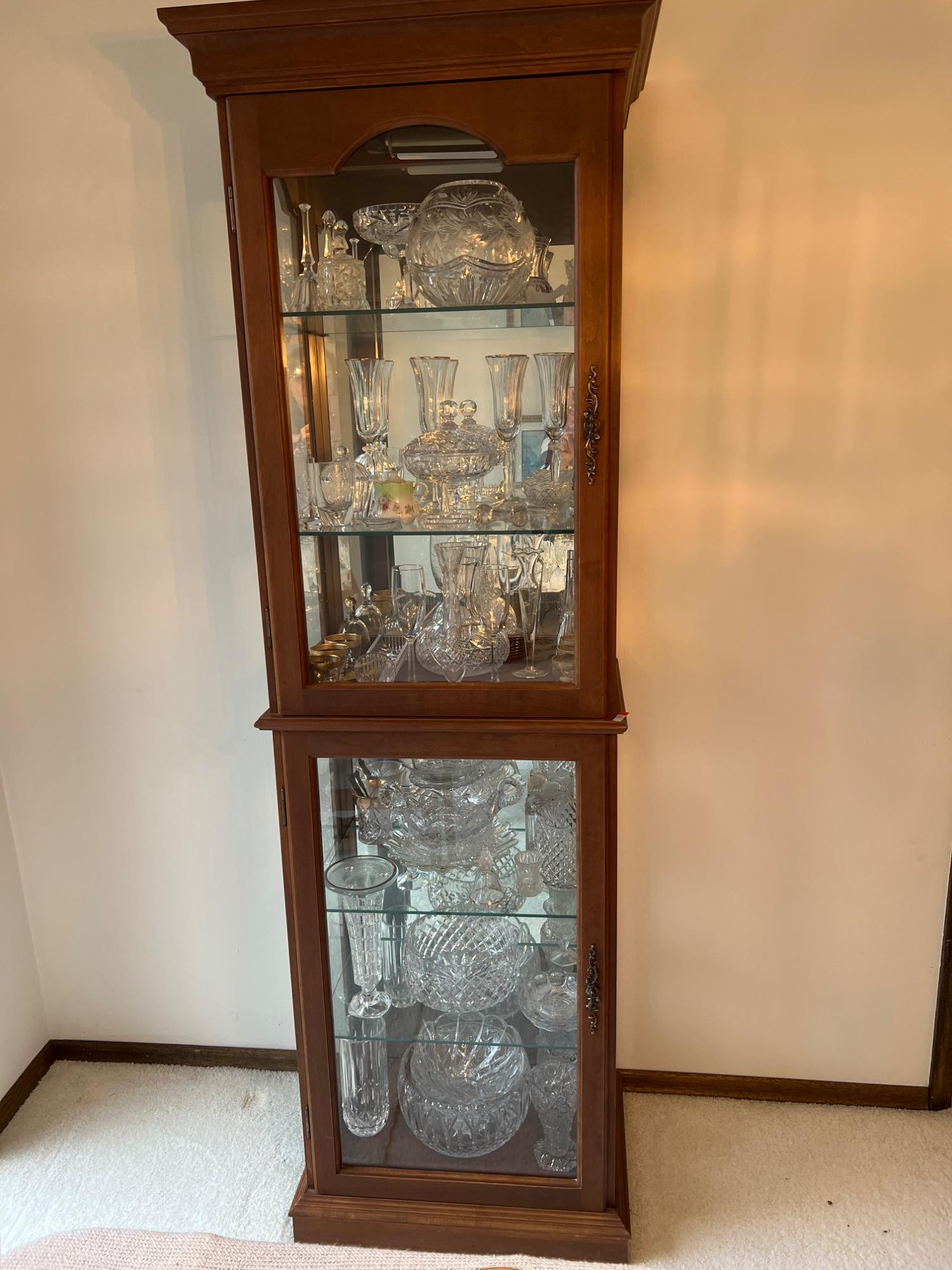 Includes all the crystal serving dishes, candy dishes, decorations, cups, and much more. Cabinet is mahogany wood with two lights, upper and lower, three shelves in each section, two doors. Glass on three sides of cabinet. Mirror backed. Bidding on this lot is an agreement that: (1.) You will have 2 capable, able-bodied persons to lift and load at a minimum. (2.) You