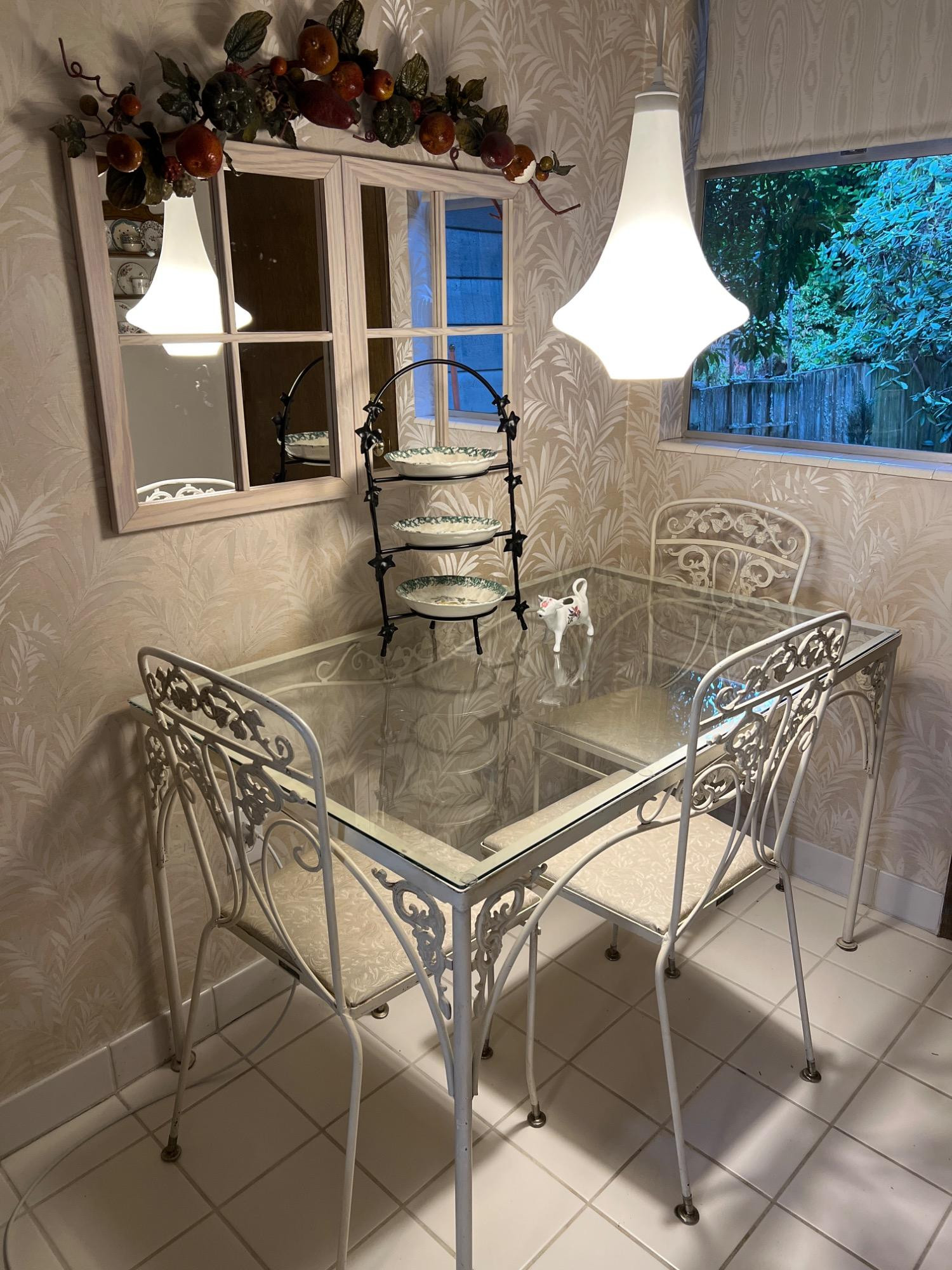 White wrought iron glass top glass top table and four (4) wrought iron chairs (one chair not pictured). Tiered entertainment server and plates, Gordon Blue cow creamer (France), paned mirror and faux fruit/leaves swag garland. Bidding on this lot is an agreement that: (1.) You will have 2 capable, able-bodied persons to lift and load at a minimum. (2.) You