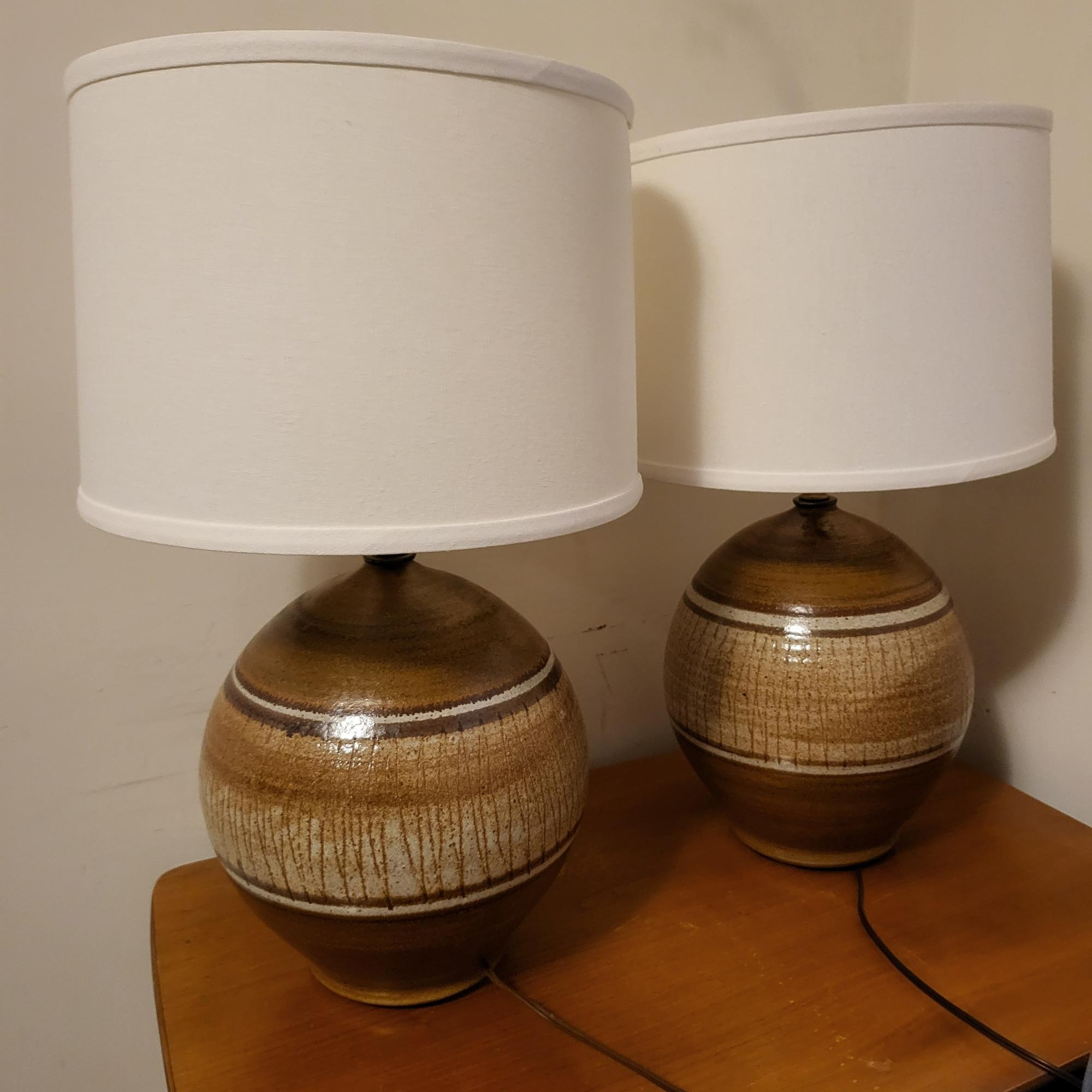 Pair of glazed earth tone, hand thrown pottery table lamps, potentially California Ceramic Designers Co. or in the style of California Ceramics. The table lamps have white stripes and contrasting earth tone pattern around the bulb base and have light beige shades.