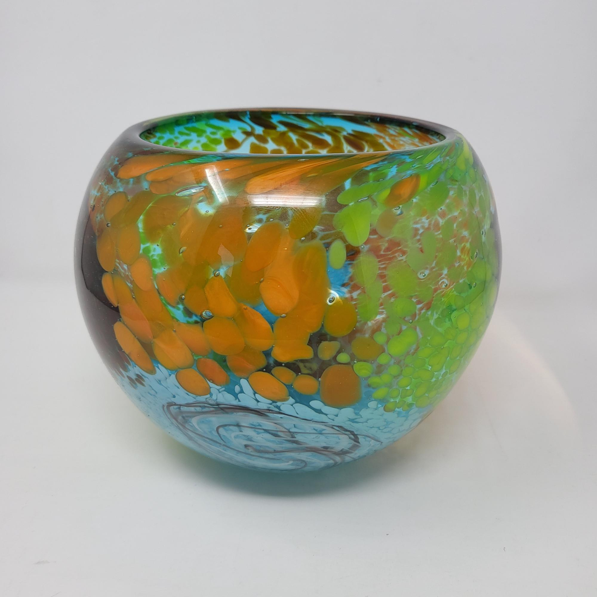 Exceptional designer-quality, heavy art glass piece. Appears to have the Dale Tiffany Merritt embedded swirl design or may be Murano glass. Orange, Green & blue stretched spots with white & black swirls.