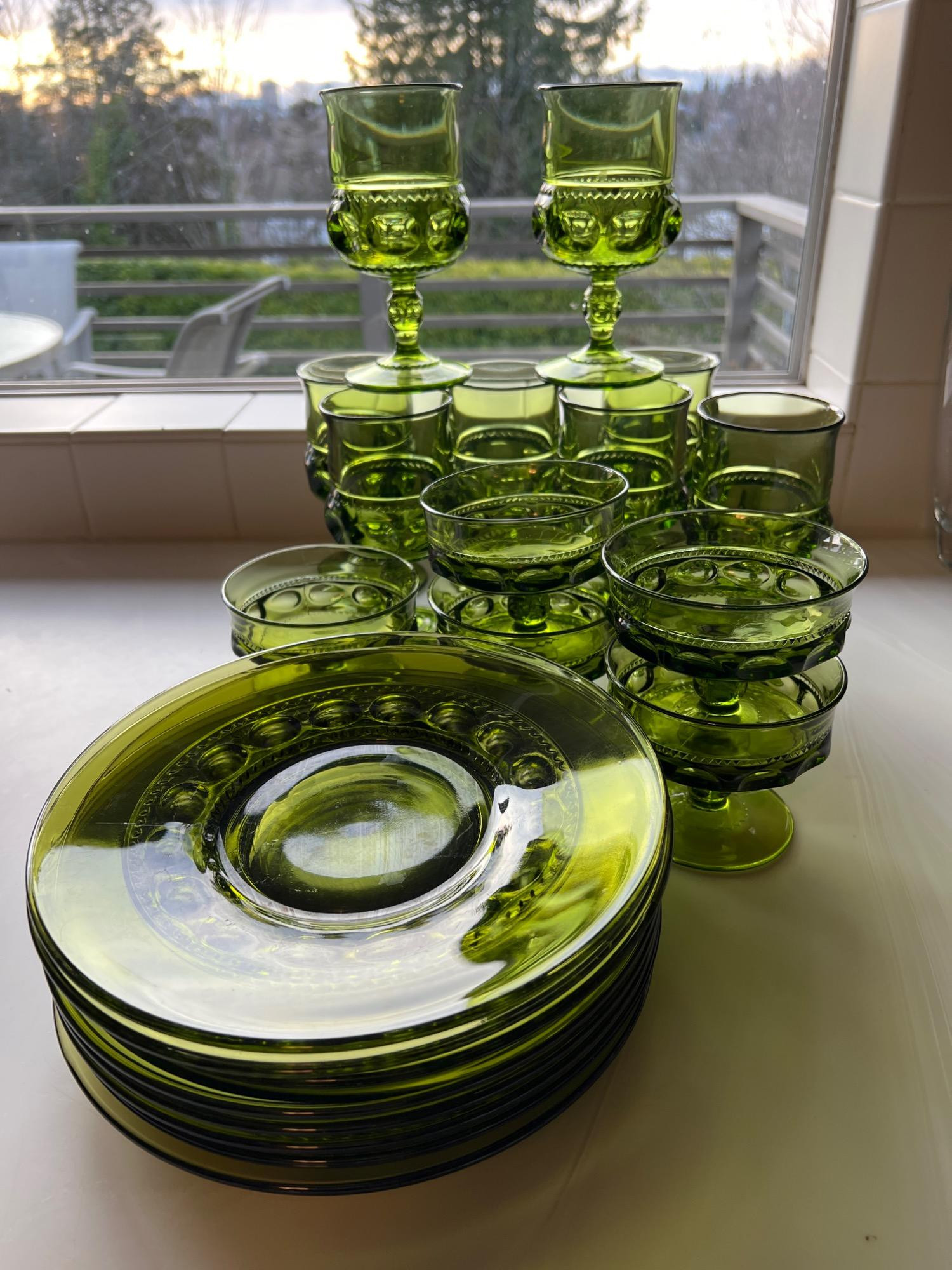 Avocado green Anchor Hocking Georgian luncheon set of glasses and plates. Tall glasses are 6 inches tall x 2 3/4 inches round; sherbert glasses are 3-3/4 inches round by 3-1/2 inches tall and the luncheon plates are 8-1/2 inches round.