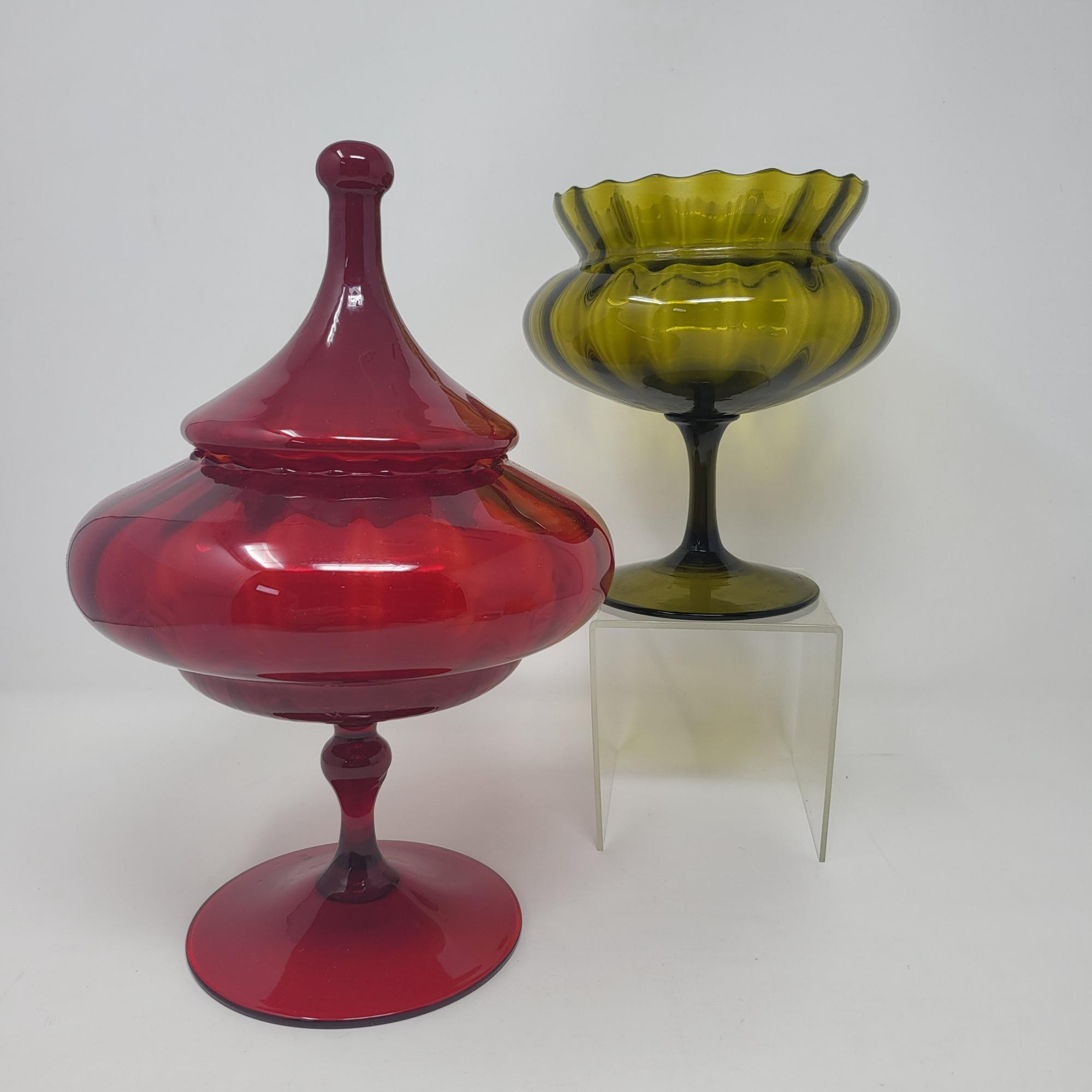 Ruby red footed candy dish with lid. 11 inches tall. Potentially Murano Empoli Optic Italian glass? No documentation but appears to be comparable to another documented on Worthpoint. Click here. Olive green vintage empoli optic glass compote candy dish. 7 inches tall. (slight chip along edge in one area)