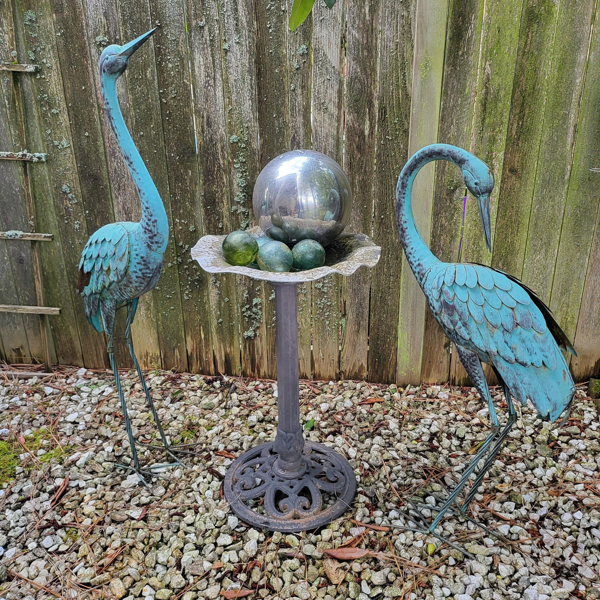 Two patina rich teal toned cranes standing at 45 inches tall and 37 inches tall. Metal birdbath is 28 inches tall by 18" diameter. There is a mirrored orb and four teal toned glass floats. The mirrored orb is 9 inches diameter and the glass floats are 3.25 inches diameter.