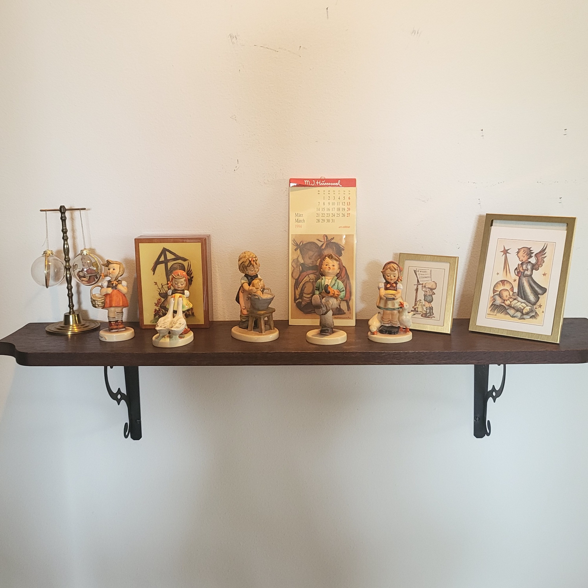 Collection of various Hummel figurines, music box, ornaments, calendar and wall decor. 1970's and 80's figurines include: Little Shopper, Goose Girl, Be Patient, Doll Bath and Happy Traveler. They all have the Goebel mark on bottom.