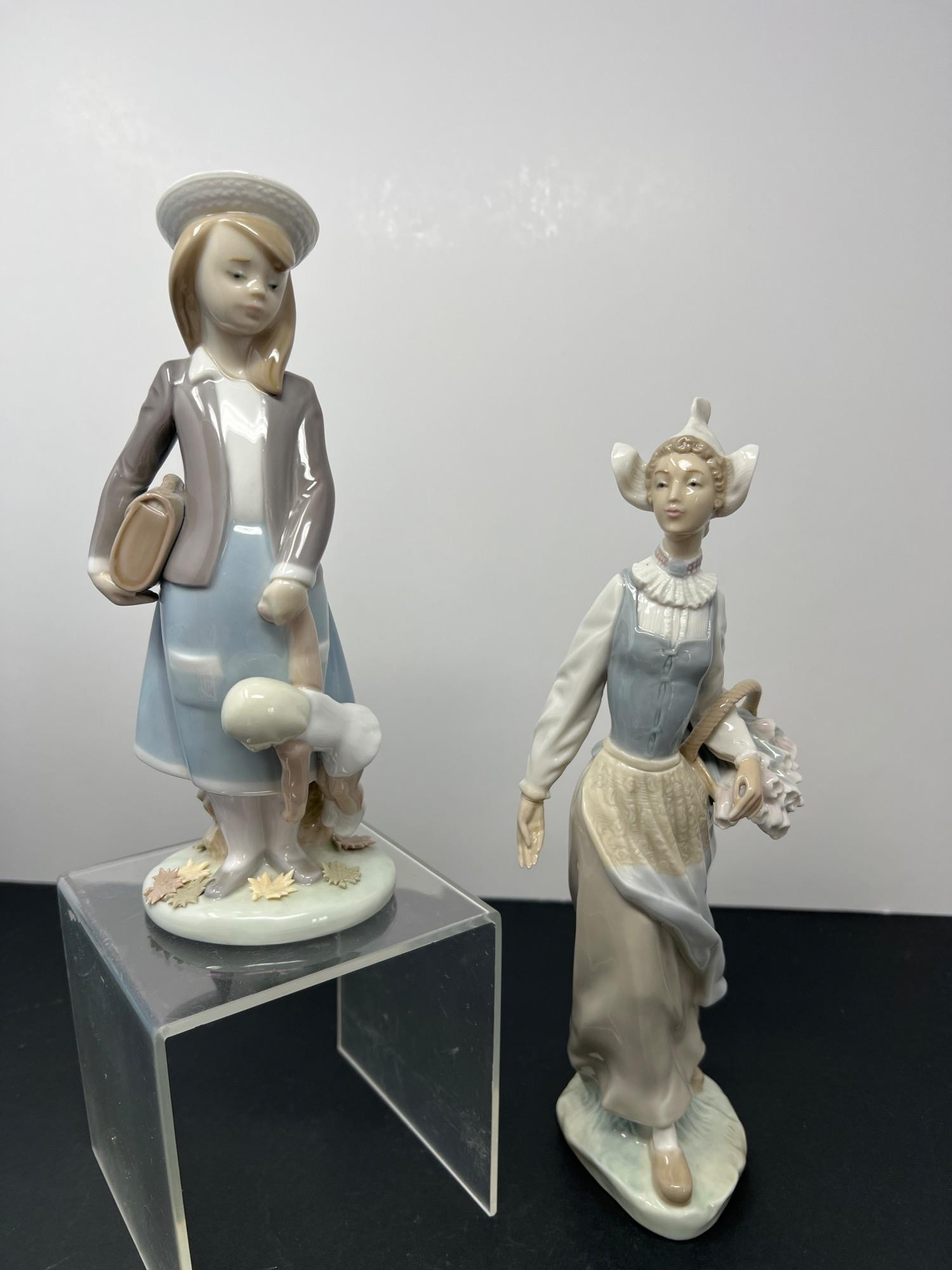 Two additional Lladro figures - orphan and doll (8 inches tall) and a signed Lladro (4/23/1999) dutch woman with basket. Exquisite porcelain figurines in which each are handmade. It appears that the dutch woman's hand may have been repaired at one time. 10 inches tall.