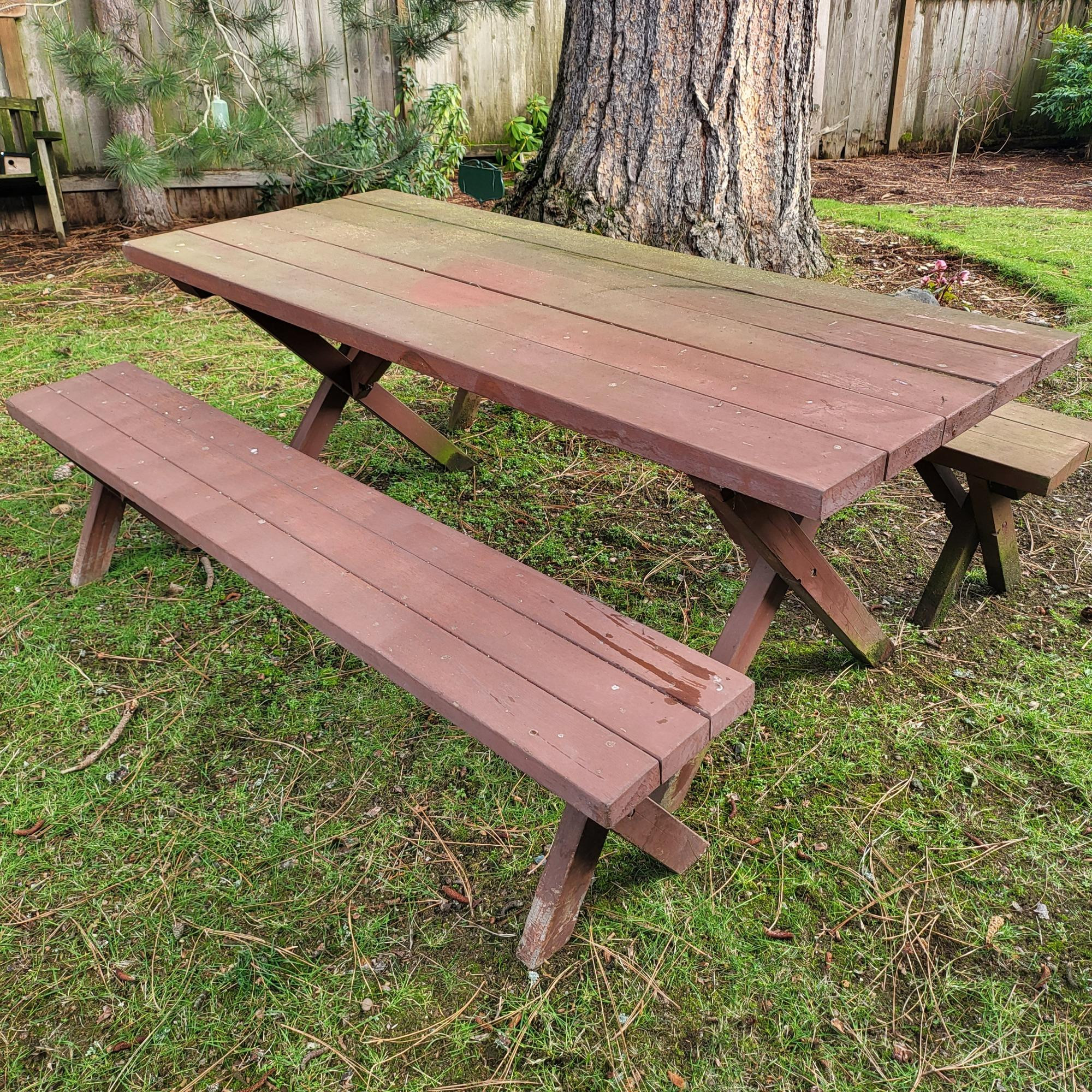 Table & Two Benches. Benches are 70" x 11" x 16.5". Good shape but needs cleaning.