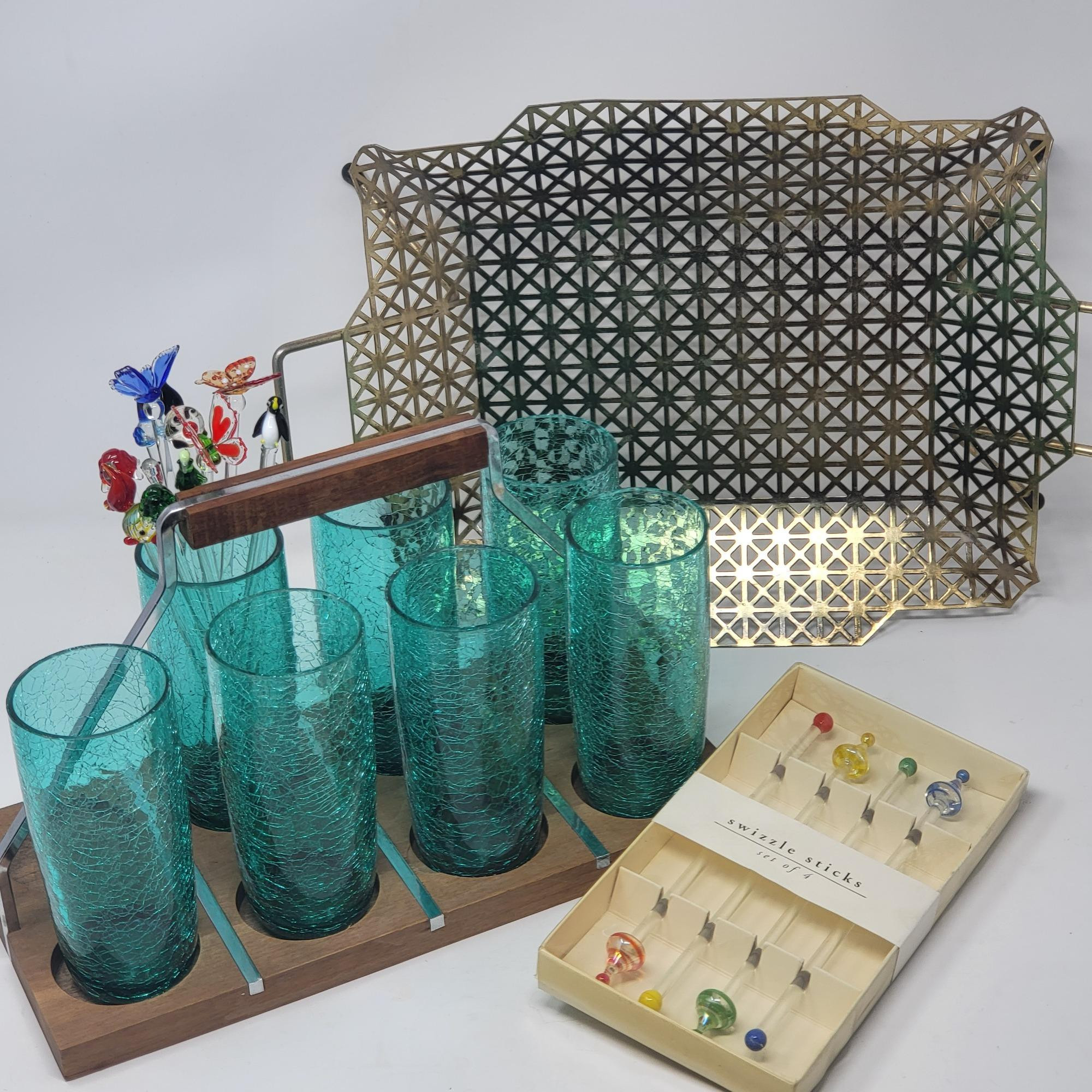 Mid century footed brass tray. Wood tray with handle. 13" x 6.5" with Seven (7) 6 inch turquoise/teal crackle glasses. Glass swizzle sticks.