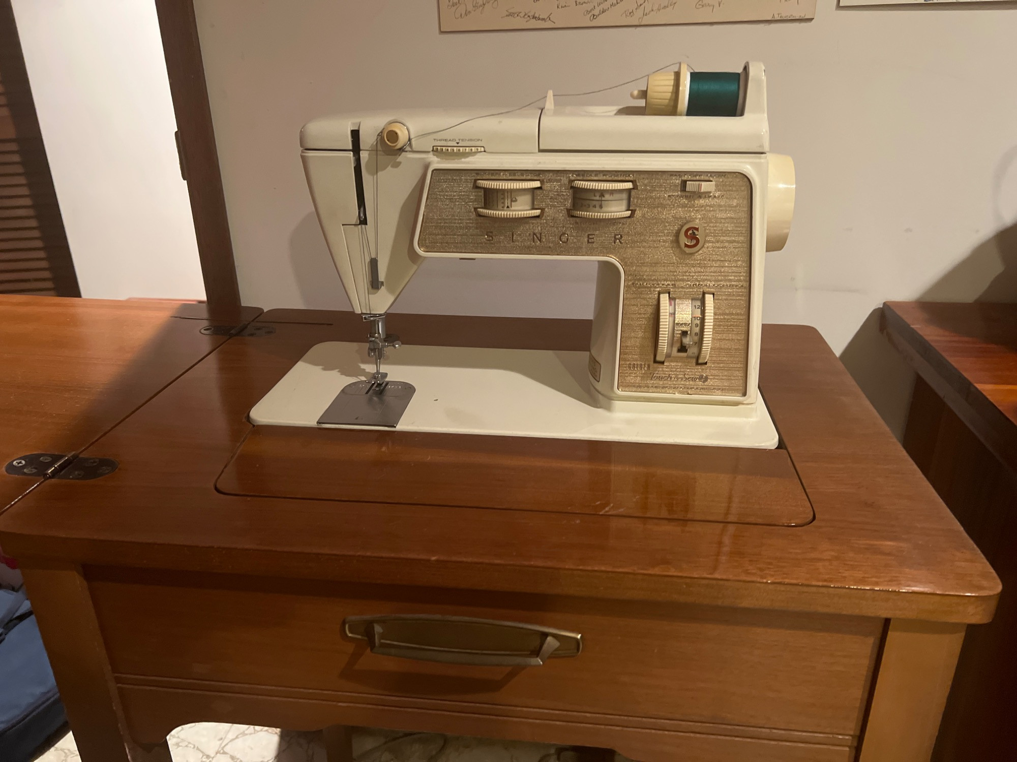 Fold away sewing machine cabinet. Touch and Go Gold Singer Sewing Machine dated the late 1960s to early 1970s. This model is known for its versatility and features, such as the one-step buttonhole, drop-in bobbin, and adjustable stitch length and width. Includes basket with accessories and foot pedal. Bidding on this lot is an agreement that: (1.) You will have 2 capable, able-bodied persons to lift and load at a minimum. (2.) You