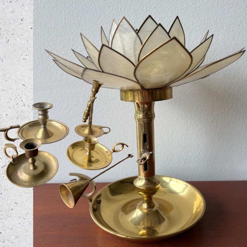 Brass candlesticks range from 4” tall to 10” tall. They are all chamberstick style. Included is a brass snuffer.