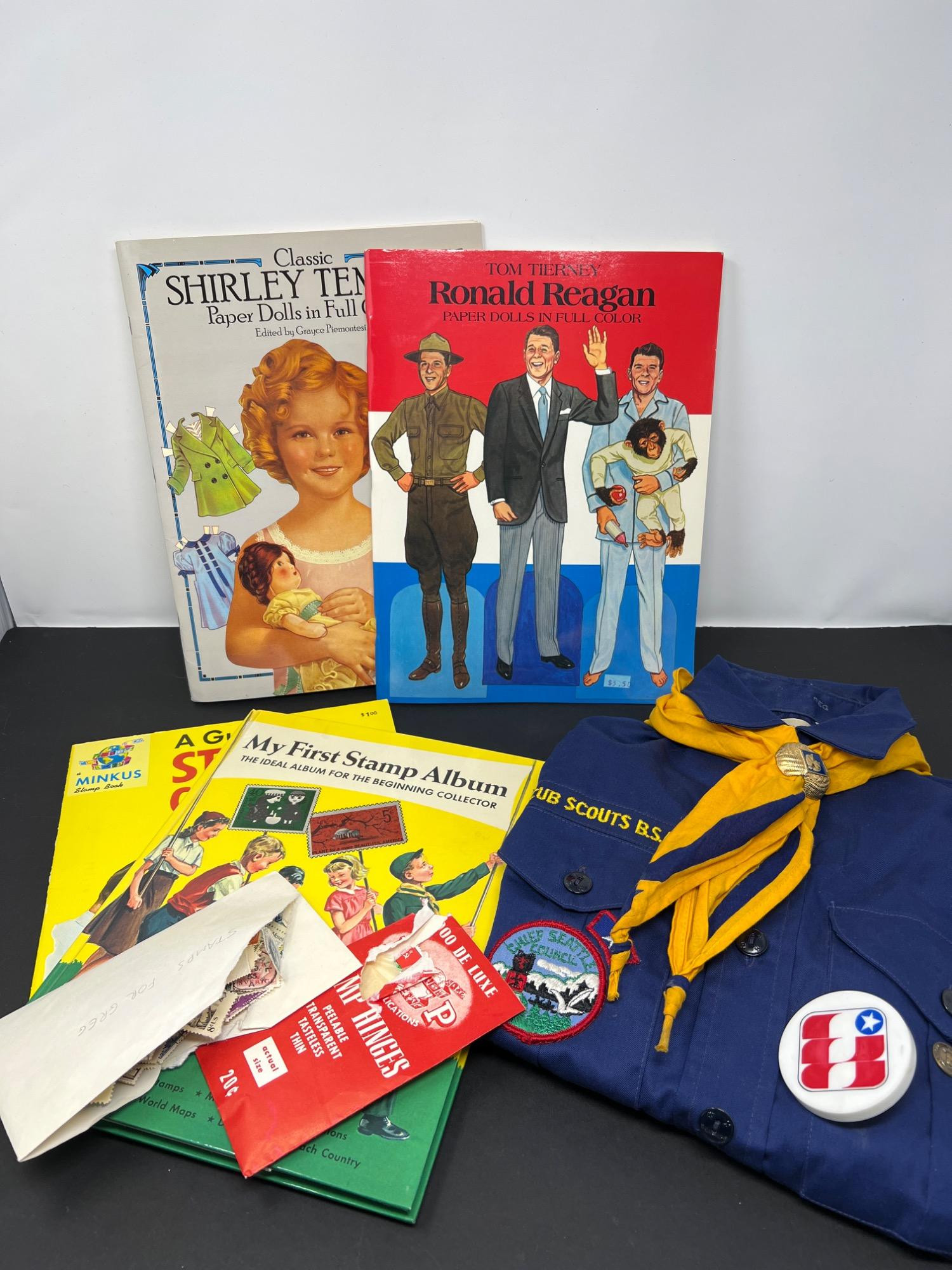 Shirley Temple (1936) and Ronald Reagan (1934) Full Color Paper Doll Booklets. Cub Scout Decorated Official Boy Scout Shirt and Neck Kerchief with Bolo. My First Stamp Outfit set with envelope of stamps.
