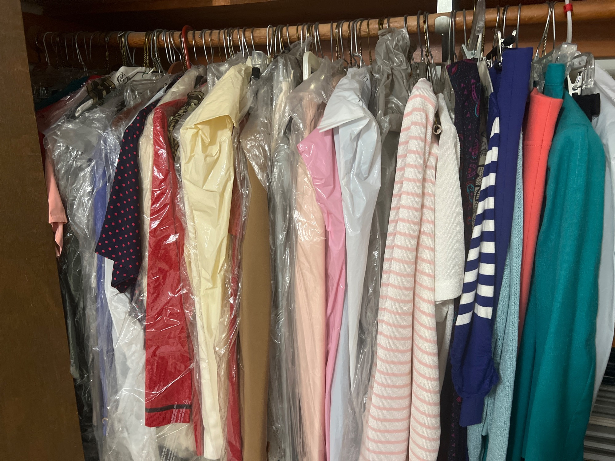 This entire closet contains exceptional vintage women's clothing sizes 10 to 14. Some of the brands include Nordstrom, Jones New York, Bicci, Cambridge Spirit, San Remo and many, many more. There are dresses, skirts, evening dresses, tops, and coordinating pant and skirt suits.