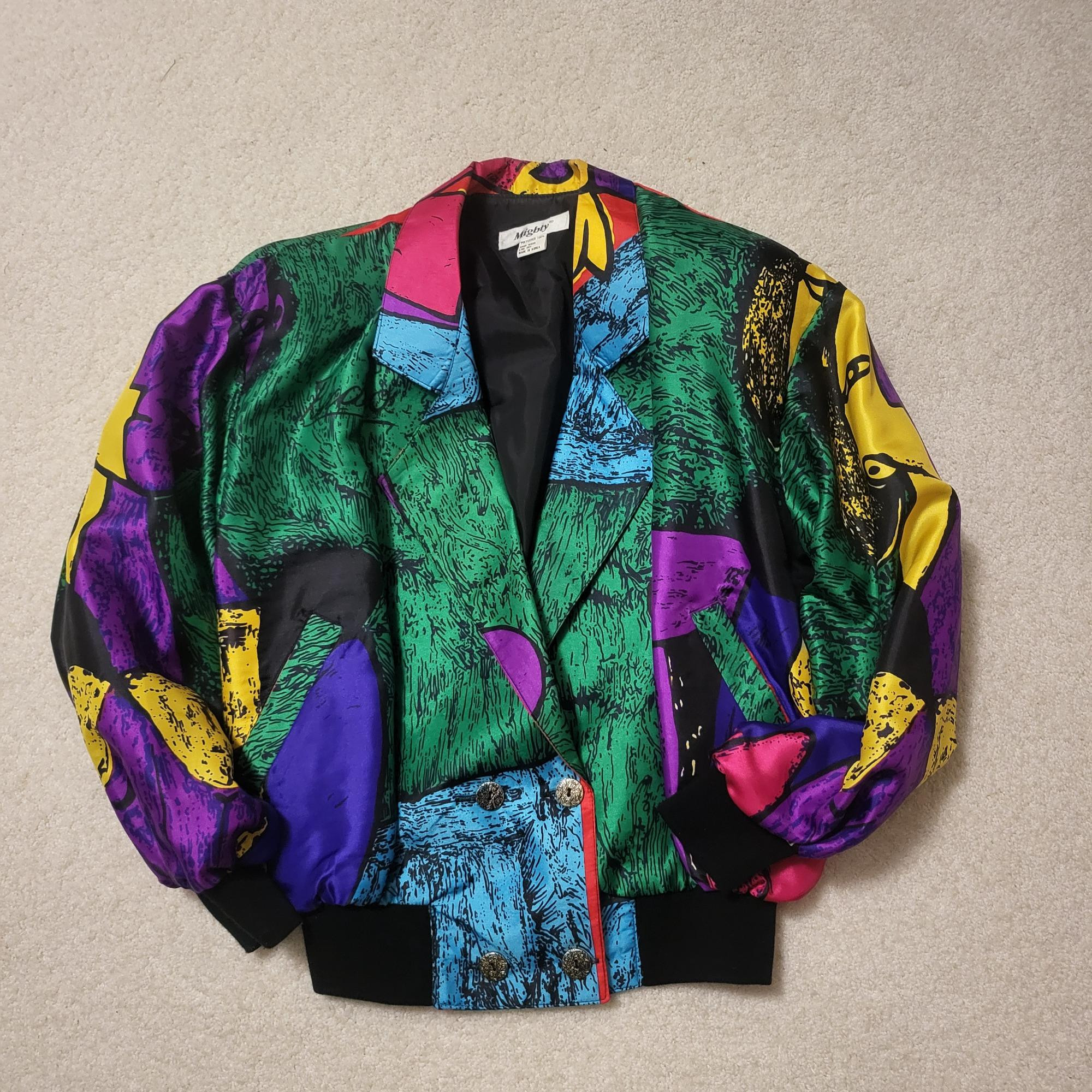 1980's Picasso abstract pop art puffy blazer style jacket with snap front by Mighty brand. Size not noted on tag though likely a size Medium/Large (measures 18" shoulder to shoulder). It is made from polyester and has a satin feel. Made in Korea.
