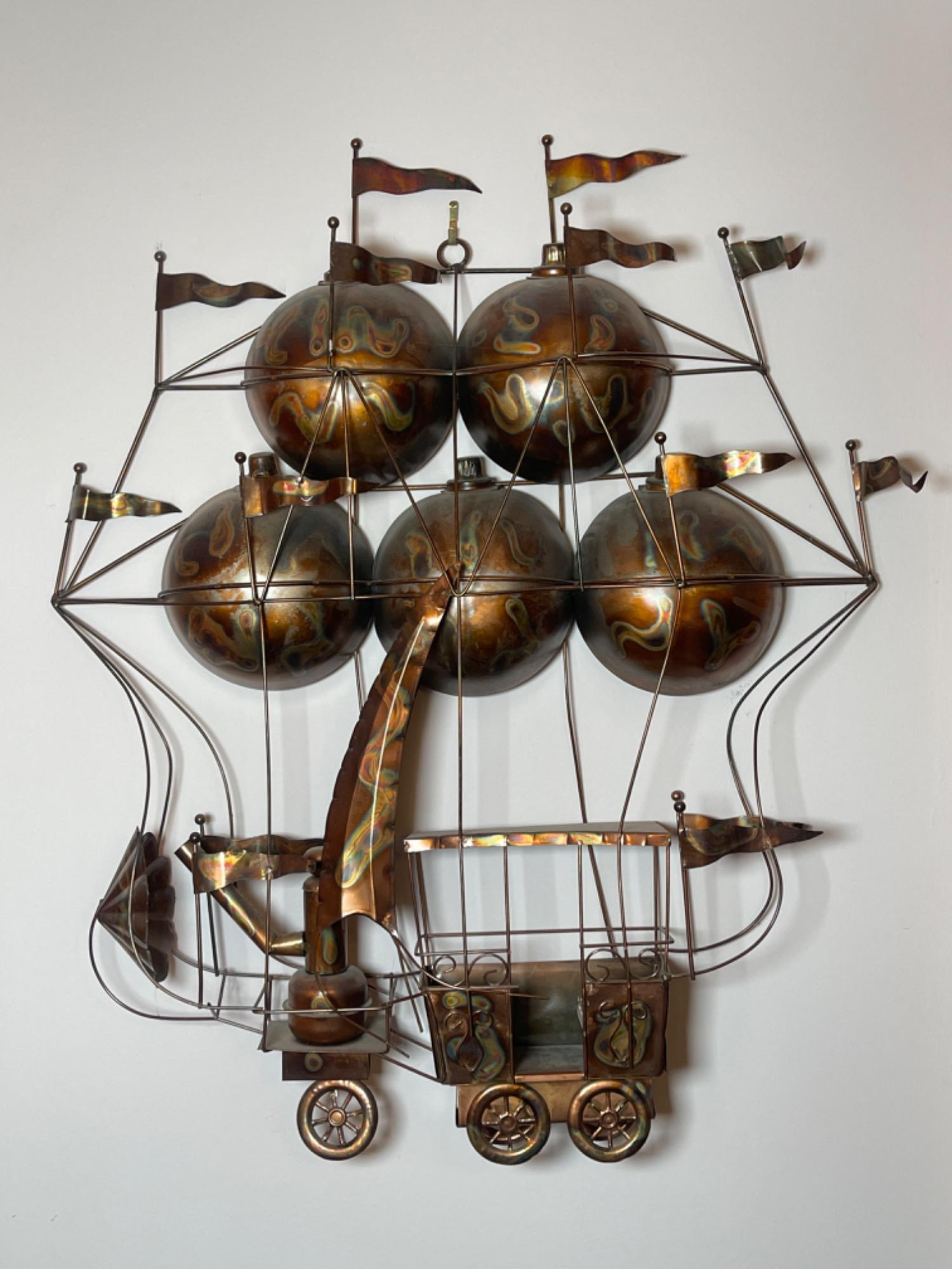 Vintage Mid-Century Hot Air Balloon Wall Art – Metal Sculpture This stunning mid-century metal wall art features a unique hot air balloon ship design, combining industrial craftsmanship with whimsical charm. Made of wrought iron and brass-toned metal, this piece showcases intricate detailing, including spherical balloon elements, decorative flags, and a carriage-like gondola. A true statement piece, perfect for collectors of mid-century modern décor, aviation enthusiasts, or anyone looking to add vintage flair to their space. A rare and eye-catching find! While piece has some tarnishing, it is in incredible condition.