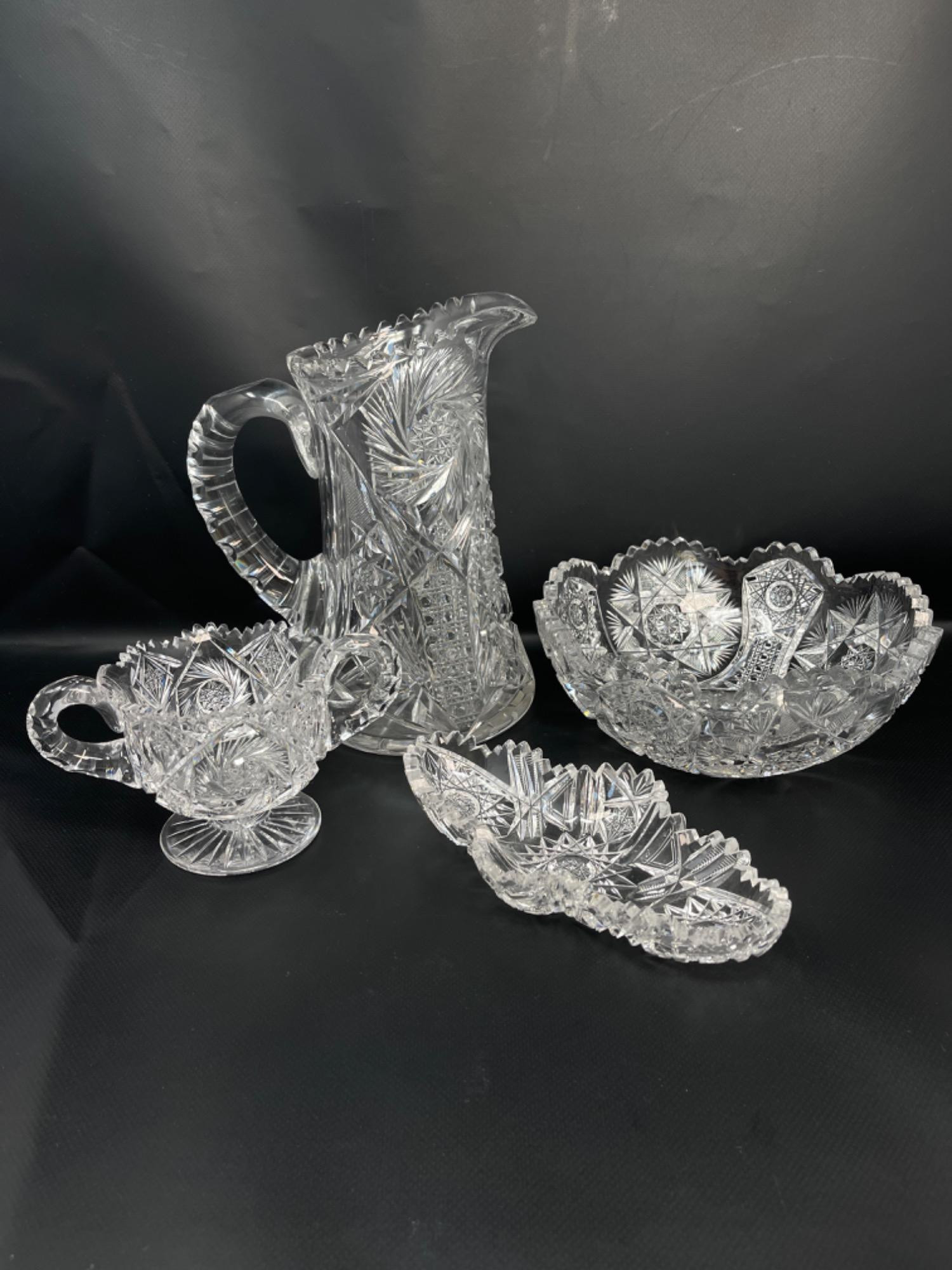 Vintage Lead Crystal Collection – Intricate Cut Glass Pieces This stunning vintage lead crystal collection features beautifully cut glass pieces with intricate patterns and brilliant clarity. The set includes a variety of elegant pitchers, bowls, and serving pieces, each showcasing fine craftsmanship and timeless appeal. Perfect for collectors, vintage glass enthusiasts, or anyone looking to add classic elegance to their home décor. Whether displayed or used for special occasions, these crystal pieces make a stunning statement!
