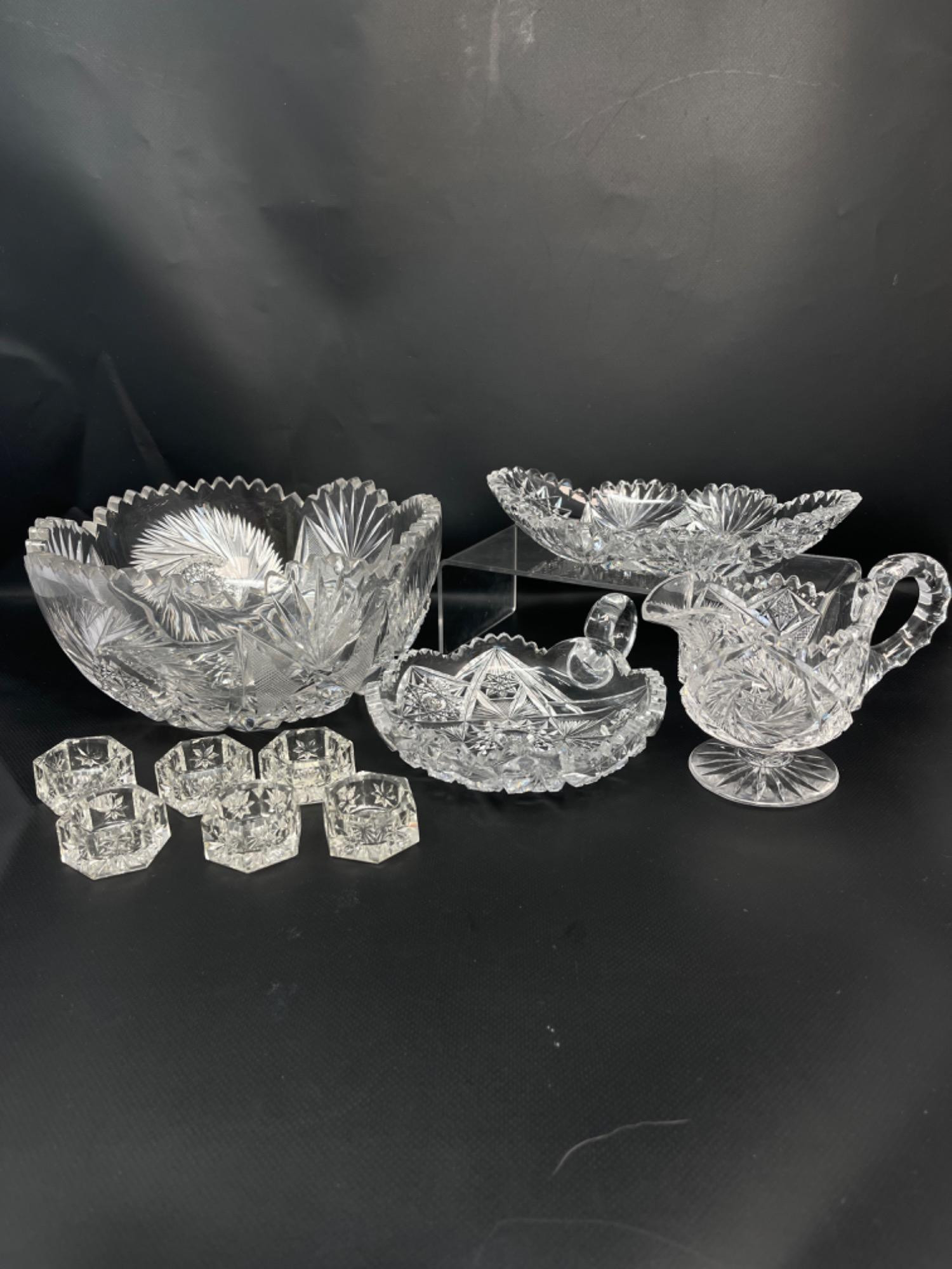 Vintage Lead Crystal Serving & Tableware Collection This exquisite vintage lead crystal collection is perfect for elegant table settings or display. Featuring beautifully cut glass with intricate patterns, the set includes bowls, a creamer, a sugar dish, and other serving pieces, with the largest measuring 4.25” H and the smallest at 1” H. The hexagonal salt cellars or small dishes add a delicate touch, showcasing finely detailed faceted cuts. Designed with scalloped edges, starbursts, and brilliant cuts, each piece catches the light beautifully. Pieces have a few minor chips. Please see photos. Display stand NOT included.