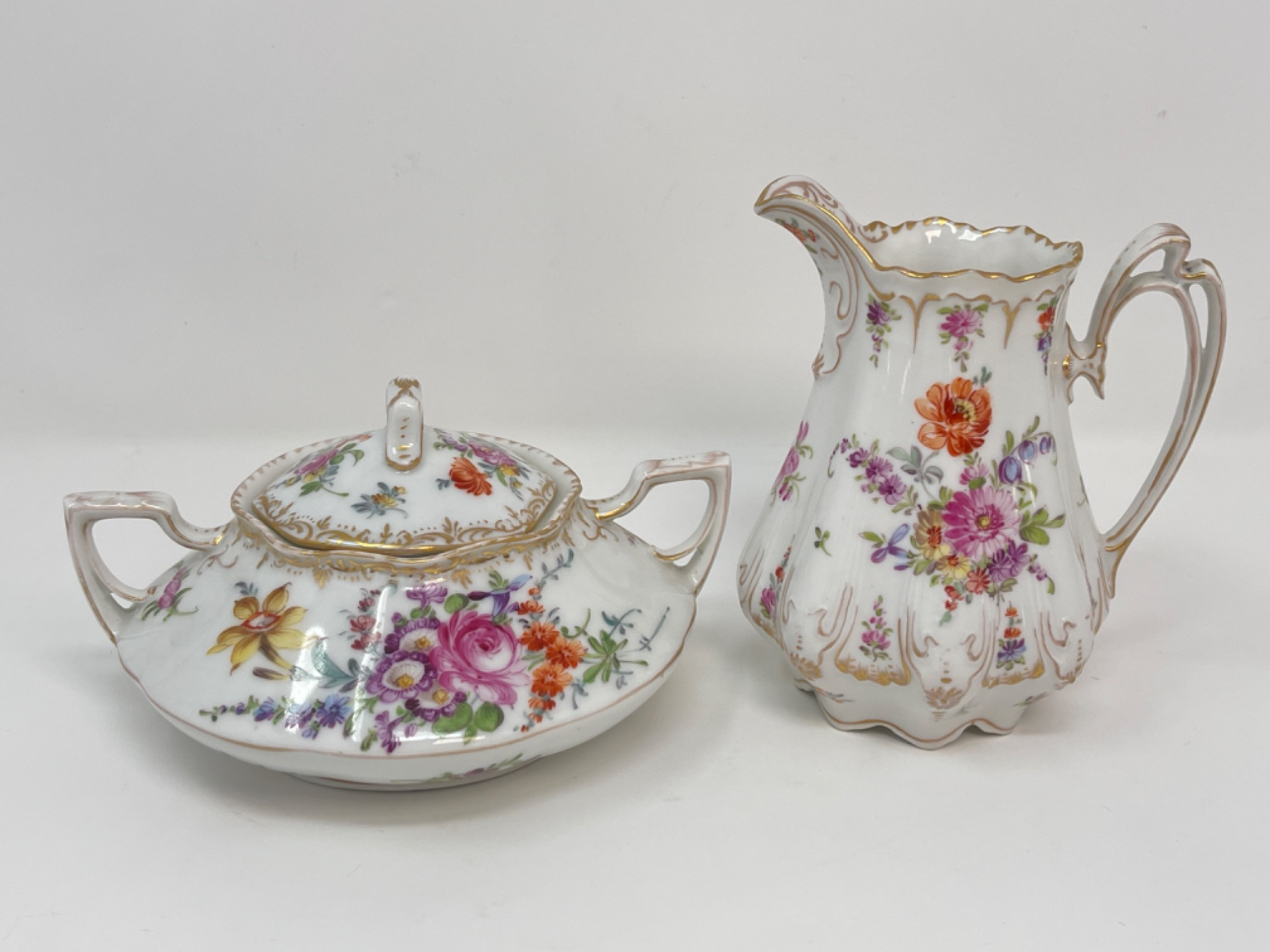 Vintage Dresden Porcelain Dish Set A beautifully decorated Dresden porcelain dish set featuring intricate floral designs and elegant gold accents. The set includes a lidded sugar bowl and a matching creamer, both showcasing the delicate craftsmanship Dresden porcelain is known for. Dimensions: 2.5” - 4.5” H
