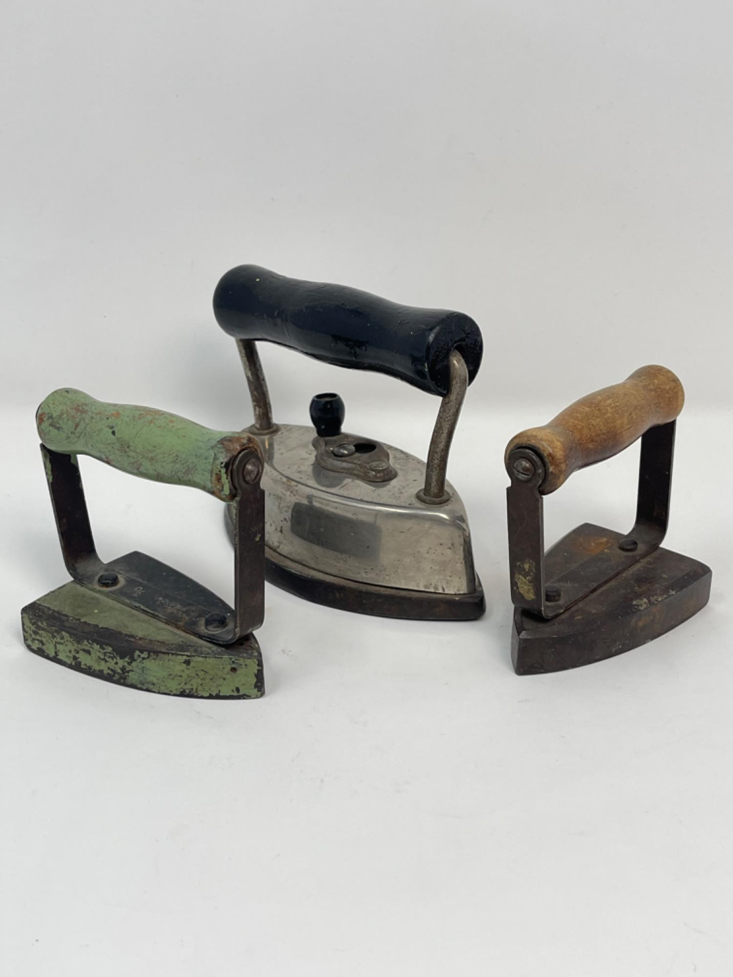 Set of 3 Vintage Miniature Irons A charming collection of three vintage miniature irons, each with a unique design and patina, showcasing their history and character. These small irons feature wooden handles in varying shades, with one having a distinct green finish. The metal bases have signs of age, adding to their rustic appeal. Perfect for collectors of antique household items, decorative displays, or as conversation pieces in a vintage-inspired setting. Smallest: 2.75" W Largest: 4.75" W