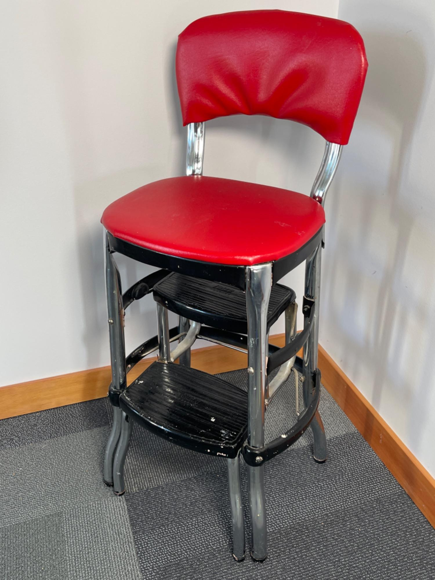 Vintage Red Cosco Step Stool This classic Cosco step stool features a vibrant red vinyl seat and chrome frame, offering both style and function. The built-in retractable steps provide a convenient way to reach higher spaces while doubling as a comfortable counter-height chair. With its sturdy black metal steps and mid-century design, this piece is perfect for retro kitchen décor, garage workspaces, or as a collectible vintage utility stool.