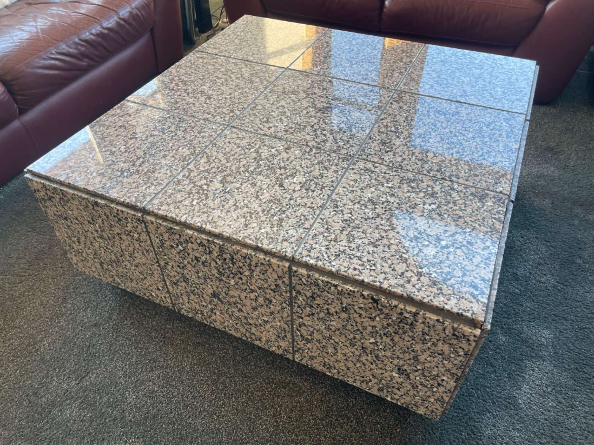 Handcrafted Modern Granite Tile Coffee Table – Custom Made by the Owner This one-of-a-kind modern coffee table was expertly handcrafted by the auction owner, showcasing a sleek tile surface with a polished granite finish. Designed with bold geometric aesthetics and durable craftsmanship, this unique piece adds a stylish and functional touch to any living space. The neutral tones and clean lines make it a versatile fit for contemporary, industrial, or minimalist decor. PLEASE NOTE: This is EXTREMELY HEAVY. You will need to bring the proper personnel and tools to safely remove from property. Holding together well.