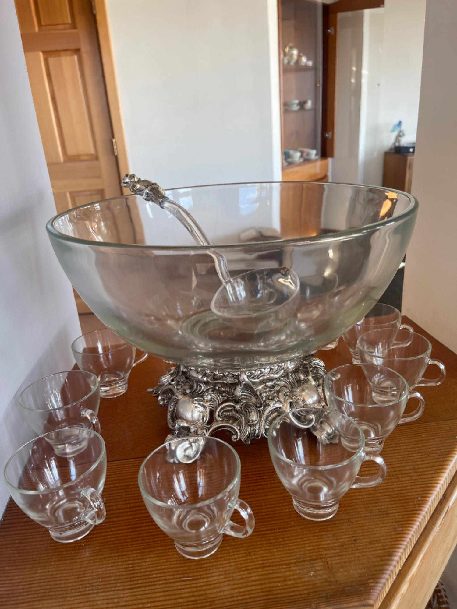 Elegant Vintage Silverplated Punch Bowl Set This stunning vintage punch bowl set exudes timeless elegance, featuring a large glass bowl set on an ornate silverplated stand with intricate detailing. The decorative base elevates the bowl, making it a perfect centerpiece for special occasions. Included in the set is a matching silver-handled ladle and a collection of clear glass punch cups, allowing for a classic serving experience. Minor tarnishing. Good used condition.