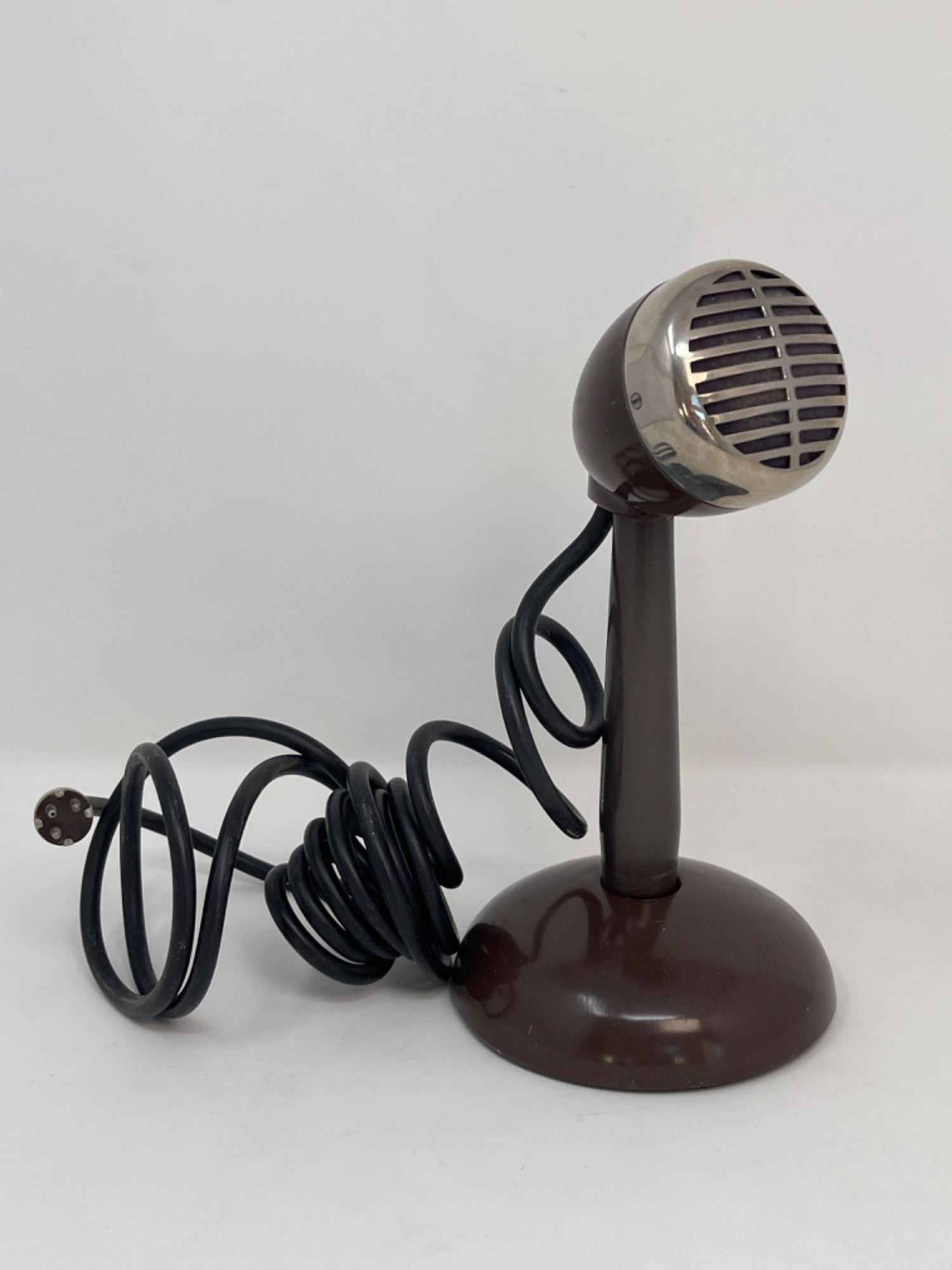 Vintage Desktop Microphone This vintage desktop microphone, standing 8.5” high, features a sleek mid-century design with a brown metal body, chrome grille, and a sturdy round base. It has a coiled cord and a streamlined, industrial aesthetic, making it a great collectible for radio, broadcasting, or vintage electronics enthusiasts. UNTESTED.