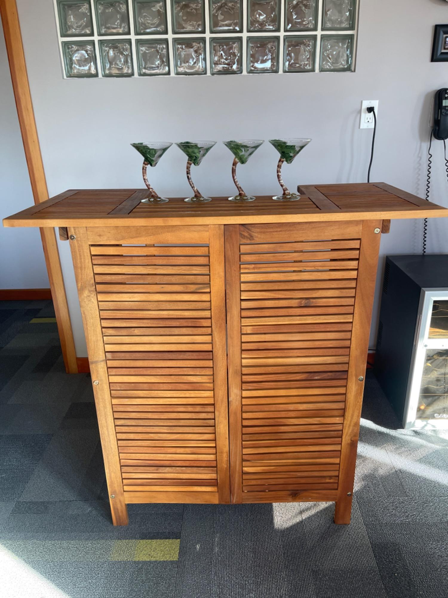 Tropical-Inspired Wooden Bar with Hand-Painted Palm Tree Glasses This coastal-style bar set is perfect for home bars, patios, tiki lounges, or beach-inspired spaces. Whether you're shaking up a cocktail or serving up a refreshing drink, this charming bar and glassware combo is a must-have for entertainers and beach lovers alike. Bar is in great condition with minor scuffs and scratches. Glasses are in great condition and look barely used. Bidding on this lot is an agreement that: (1.) You will have 2 capable, able-bodied persons to lift and load at a minimum. (2.) You will bring a hand truck and/or any other tools needed to remove this item. If these steps are not followed your item will be forfeited and no refund given.