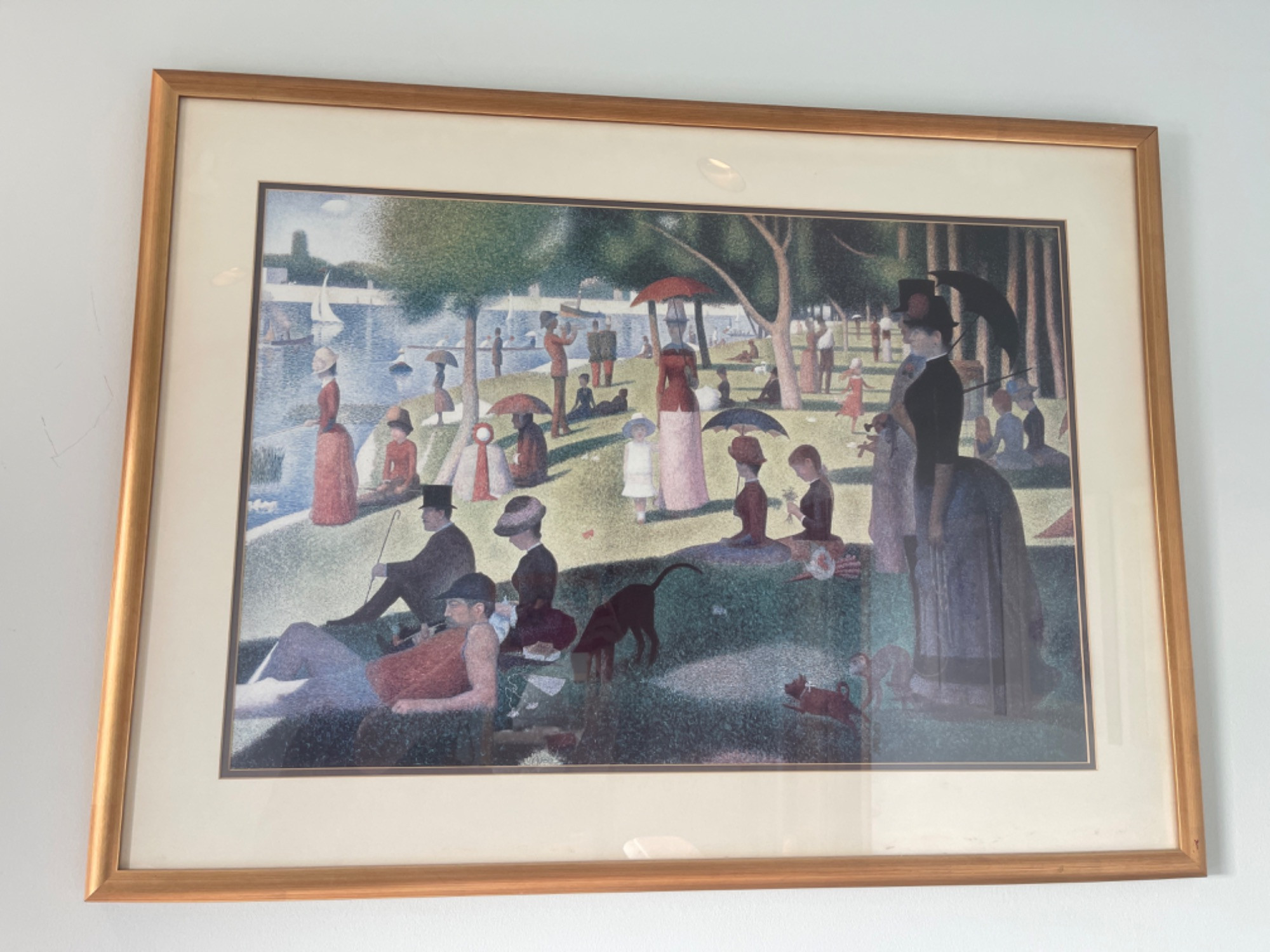 Framed Print – "A Sunday Afternoon on the Island of La Grande Jatte" by Georges Seurat Bring an iconic masterpiece into your space with this framed print of A Sunday Afternoon on the Island of La Grande Jatte, one of the most celebrated works of Georges Seurat. Originally painted between 1884-1886, this artwork is a prime example of Pointillism, a revolutionary painting technique developed by Seurat himself, in which tiny dots of pure color are meticulously placed to form a vibrant and cohesive image. Details: Artist: Georges Seurat (1859–1891) Artwork Title: A Sunday Afternoon on the Island of La Grande Jatte Style: Pointillism / Post-Impressionism Frame: Elegant gold-tone frame with a matte border, enhancing its museum-quality appearance. Condition: Excellent with minimal signs of wear. Frame has some scuffs and scratches. This serene and mesmerizing scene captures Parisians leisurely enjoying a day by the Seine River, embodying both precision and harmony through its innovative technique. A must-have for art lovers, collectors, or anyone looking to add a sophisticated touch to their decor. Own a piece of art history with this stunning framed print of Seurat’s most famous work!