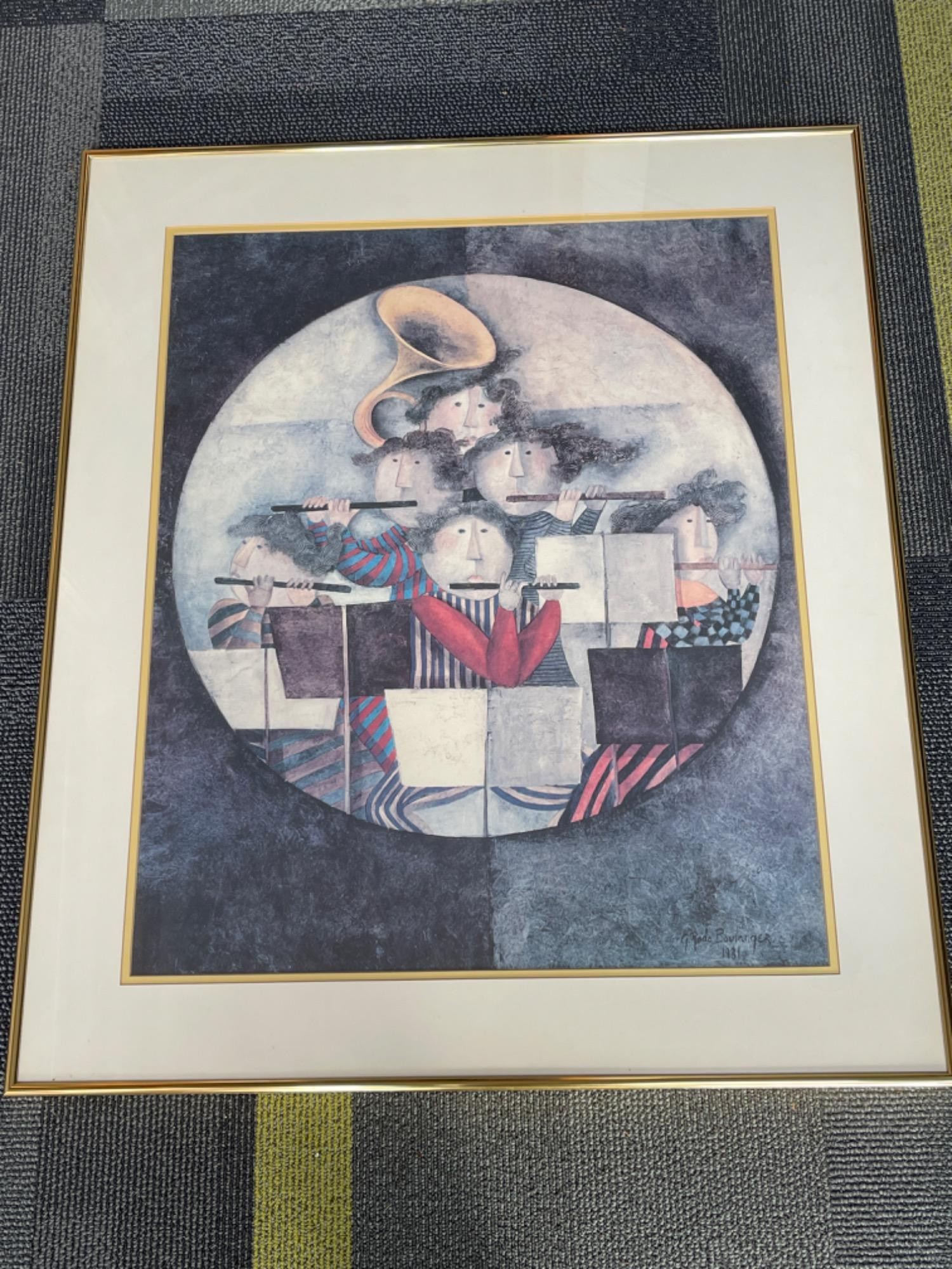 Framed Print – "Whimsical Orchestra" by Graciela Rodo Boulanger This whimsical orchestra scene captures the joy and movement of music, making it a perfect addition to a music room, creative space, or art collection. The muted tones and lively composition make it a conversation piece that will captivate any audience. Known for her distinctive playful depictions of musicians and children, Boulanger’s style blends fantasy with realism, creating delightful and expressive compositions. About the Artist: Graciela Rodo Boulanger (born 1935) is a Bolivian painter and printmaker celebrated for her enchanting artwork that often features exaggerated figures with whimsical expressions. Her work is heavily influenced by her background in music, and she has gained international recognition for her colorful, joyful portrayals of musicians, dancers, and children. Print is in great condition, with only minor scuffs and scratches to frame.