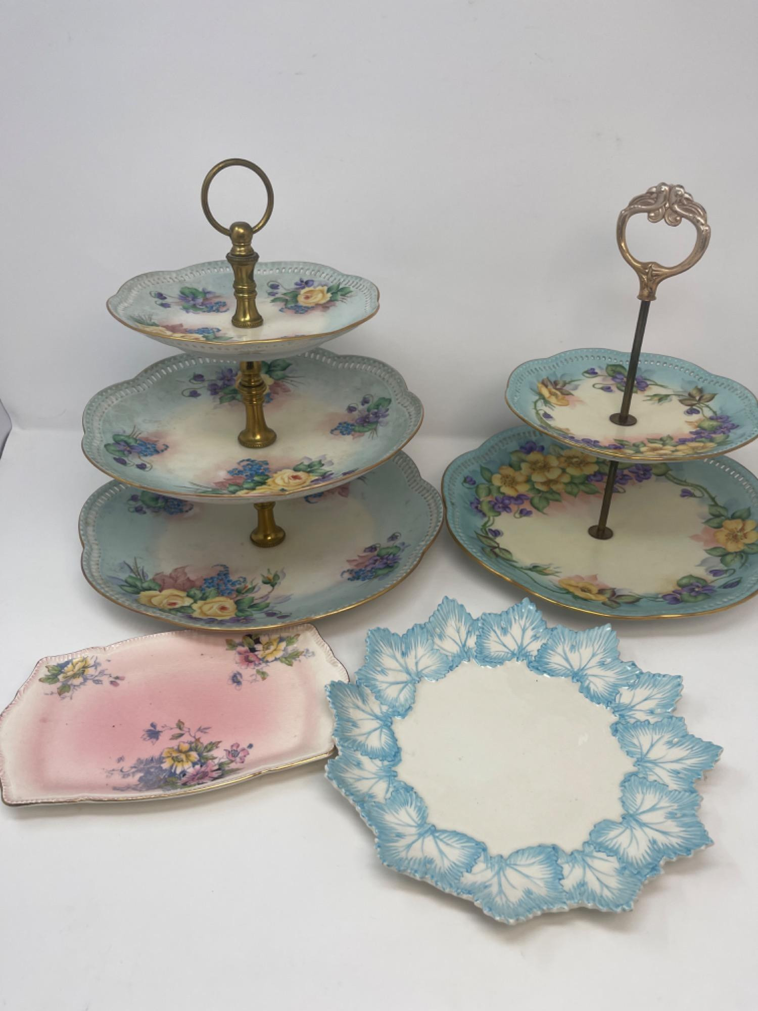 Vintage China Towers & Platters – Elegant Floral Designs This beautiful collection features vintage china towers and platters adorned with delicate floral patterns, scalloped edges, and gilded accents. The tallest tower stands 11.5 inches high, while the widest platter measures 11 inches across. These elegant serving pieces are perfect for afternoon tea, dessert displays, or classic home décor. Some items bear maker’s marks, adding to their collectible value. With graceful pastel hues and intricate detailing, this set brings timeless charm to any table setting or collection. All pieces need a deep cleaning, and have some staining. Please see photos.