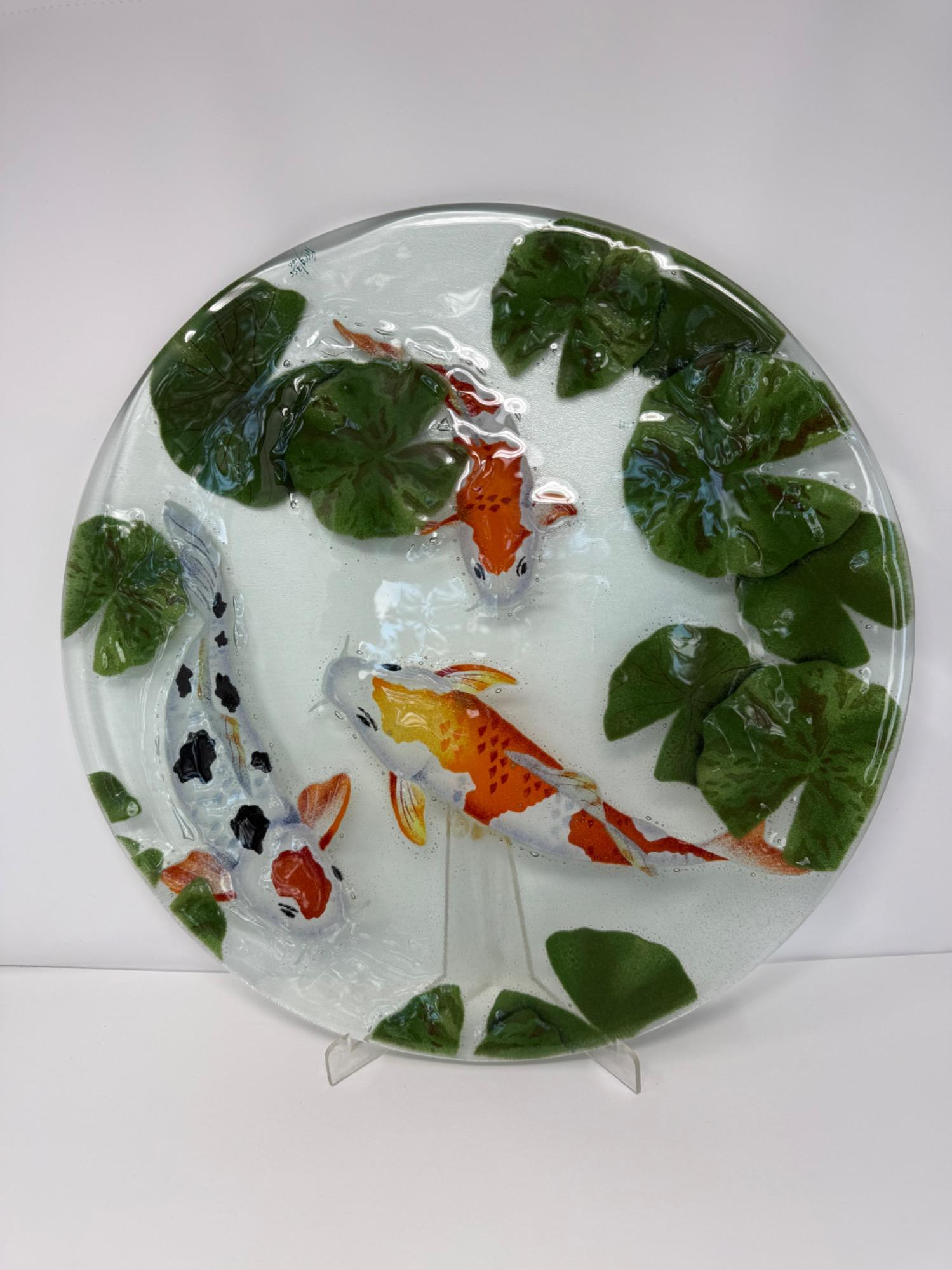 Koi Fish Glass Plate – 17.75” Decorative Art Piece. This stunning handcrafted glass plate features a vibrant koi fish and lily pad design, making it a beautiful statement piece for display or functional use. Measuring 17.75 inches in diameter, the plate showcases intricate details and a textured, three-dimensional effect, bringing the tranquil beauty of a koi pond to life.