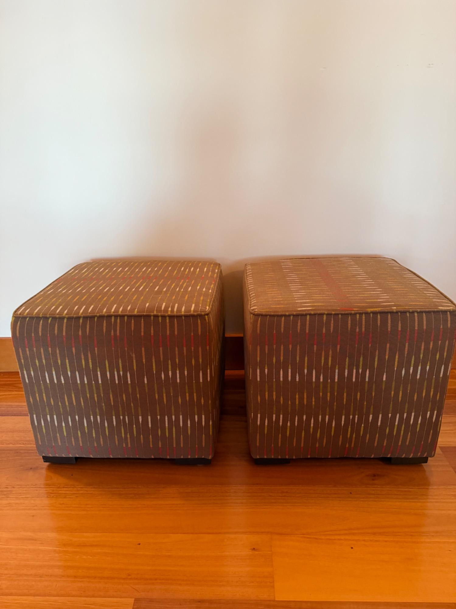 Light Brown Upholstered Ottomans - Lightweight. Add comfort and versatility to your living space with this pair of light brown upholstered ottomans. Featuring a contemporary fabric design with subtle striped accents in earthy tones, these ottomans blend effortlessly with a variety of décor styles. Each ottoman measures 17.5” tall and 18” square, making them the perfect size for use as extra seating, a footrest, or even a small side table. The lightweight construction allows for easy mobility, while the cushioned top provides a comfortable place to rest your feet or sit. These ottomans are in good pre-owned condition, with some signs of wear consistent with use. Please review the photos for details. A stylish and functional addition to any room! Bidding on this lot is an agreement that: (1.) You will have at least 2 capable, able-bodied persons to lift and load at a minimum. (2.) You will bring a hand truck and/or any other tools needed to remove this item. If these steps are not followed your item will be forfeited and no refund given.