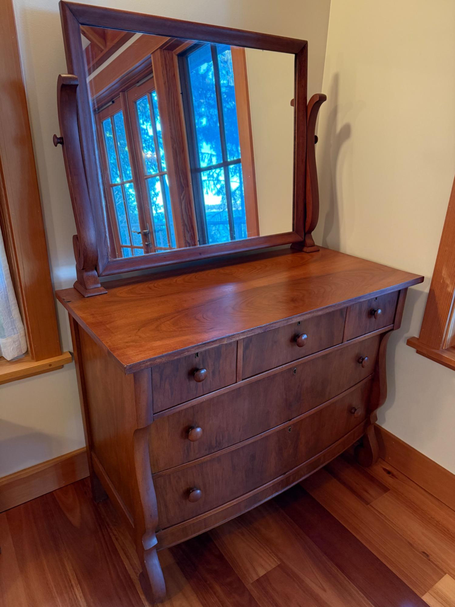Solid Wood Dresser w/ Mirror – Dovetail Drawers, Excellent Condition! This beautifully crafted solid wood dresser with an attached mirror exudes timeless elegance and quality craftsmanship. Featuring a rich wood grain finish, smooth curves, and dovetail drawers, this piece combines durability with classic style. The spacious drawers offer ample storage, while the adjustable mirror adds both charm and functionality. Measuring 34” H x 44” W x 21.5” D, with a 31” x 38” mirror, it’s the perfect addition to any bedroom, guest room, or entryway. Well-maintained and in excellent condition. Bidding on this lot is an agreement that: (1.) You will have at least 2 capable, able-bodied persons to lift and load at a minimum. (2.) You will bring a hand truck and/or any other tools needed to remove this item. If these steps are not followed your item will be forfeited and no refund given.