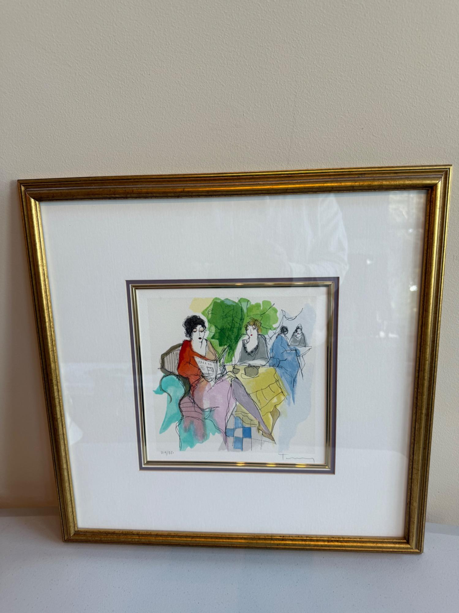 Itzchak Tarkay Watercolor – Framed Café Scene. A stunning Itzchak Tarkay watercolor print, elegantly framed and numbered. This piece captures the essence of café culture with expressive lines and rich colors, embodying Tarkay’s signature style. Measuring 16.75”W x 18.75”T, it’s a perfect statement artwork for collectors and art enthusiasts.