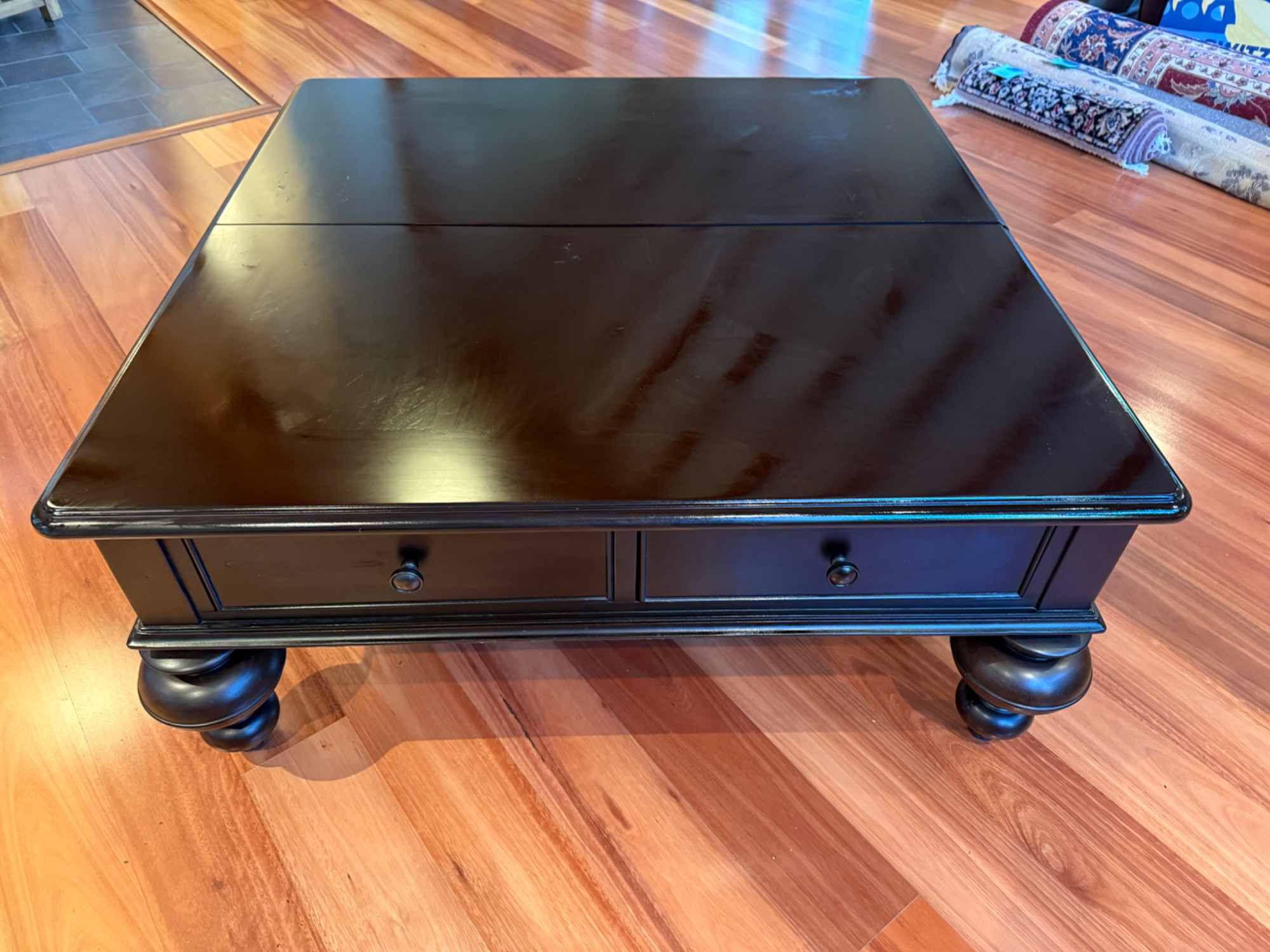 Universal Lift-Top Coffee Table w/ Storage. Sleek and functional, this Universal lift-top coffee table (44”L x 44”W x 19”H) features a dark wood finish, adjustable lift-top, hidden storage, and two spacious drawers for added convenience. A perfect blend of style and practicality for any living space. Bidding on this lot is an agreement that: (1.) You will have at least 2 capable, able-bodied persons to lift and load at a minimum. (2.) You will bring a hand truck and/or any other tools needed to remove this item. If these steps are not followed your item will be forfeited and no refund given.