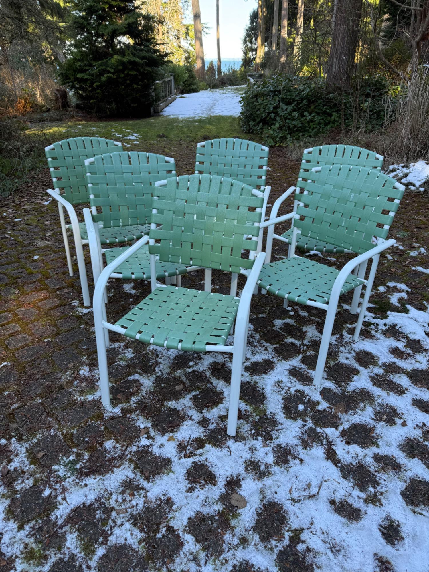 Set of 6 Vintage Patio Chairs – White Metal Frame & Green Webbing. Set of six vintage patio chairs featuring a sturdy white metal frame and classic green woven webbing for a retro outdoor look. Lightweight yet durable, perfect for patios, gardens, or poolside seating. Bidding on this lot is an agreement that: (1.) You will have 2 capable, able-bodied persons to lift and load at a minimum. (2.) You will bring a hand truck and/or any other tools needed to remove this item. If these steps are not followed your item will be forfeited and no refund given.
