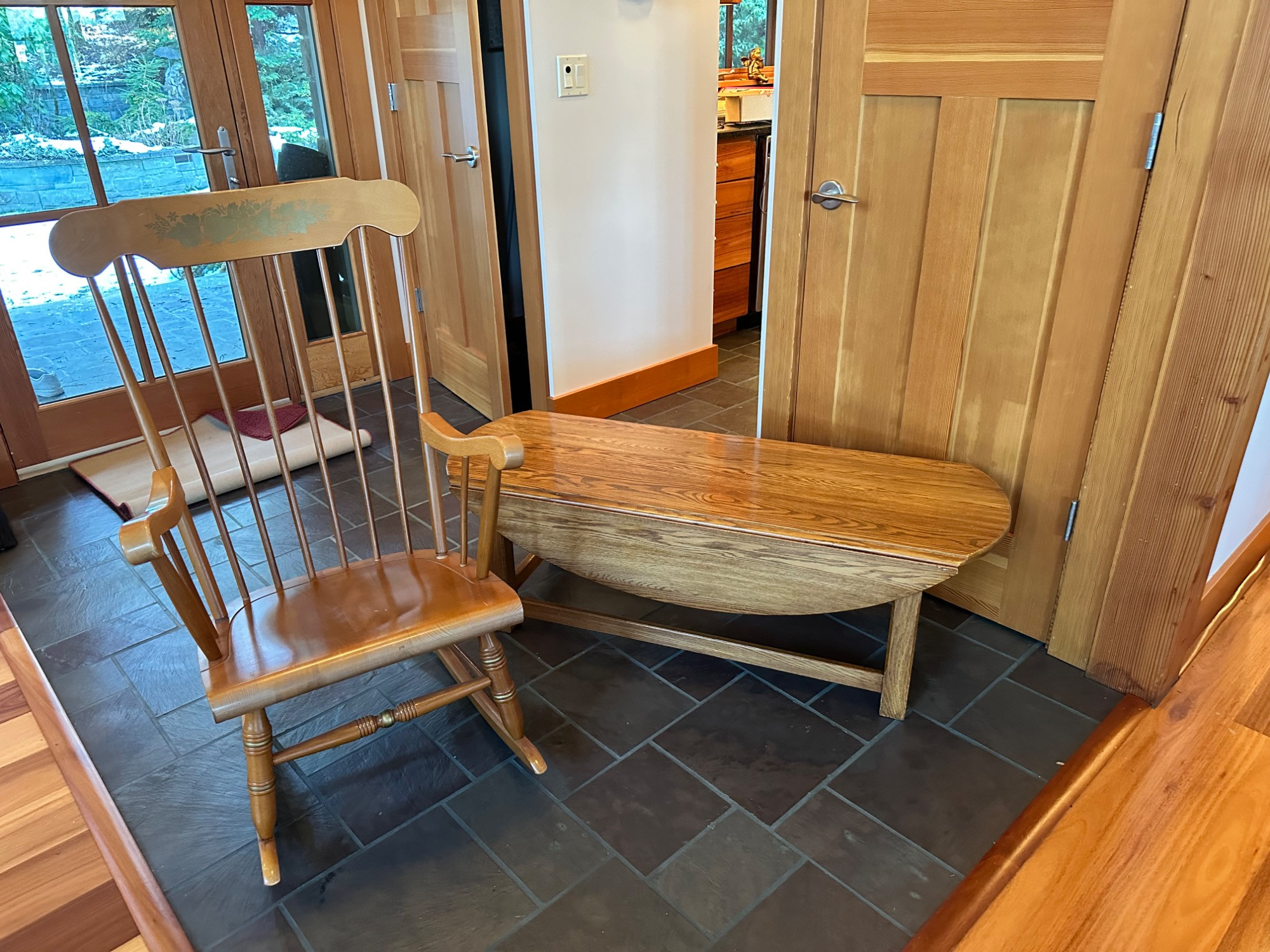 Wooden Rocking Chair & Drop-Leaf Coffee Table Set. This charming wooden furniture set includes a classic spindle-back rocking chair and a drop-leaf coffee table, perfect for adding a touch of traditional style to any home. ๐ Chair Dimensions: 23.2โ W x 30โ L x 40โ T ๐ Table Dimensions: 48โ L x 16โ T The rocking chair features a curved seat, spindle back, and elegant armrests, offering both comfort and timeless appeal. The drop-leaf coffee table provides a versatile surface, with foldable sides for space-saving convenience. Bidding on this lot is an agreement that: (1.) You will have 2 capable, able-bodied persons to lift and load at a minimum. (2.) You will bring a hand truck and/or any other tools needed to remove this item. If these steps are not followed your item will be forfeited and no refund given.