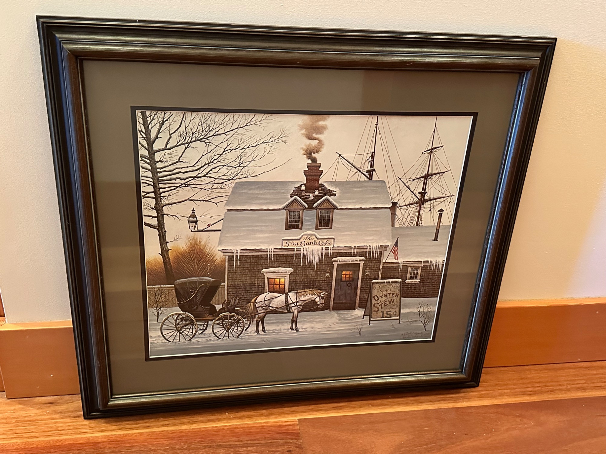 Charles Wysocki "Frog Bank Cafe" Framed Print – 23” x 26”. This Charles Wysocki framed print, titled "Frog Bank Cafe," beautifully captures a nostalgic winter harbor scene with a charming snow-covered building, a horse-drawn carriage, and sailing ships in the background. Wysocki’s signature Americana folk art style brings a warm and inviting touch to this maritime-themed piece. The print is signed and numbered, adding to its collectible value. It comes in a 23” x 26” frame with matting and glass, making it ready for display in any home or office.