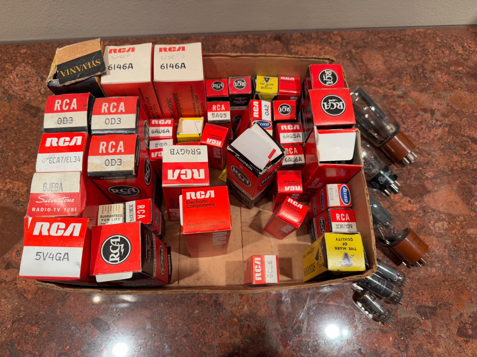 RCA & Sylvania Radio Tubes – Large Assortment in Boxes. Up for auction is a large assortment of vintage radio tubes, including RCA and Sylvania brands. Most are still in their original boxes, with some showing signs of use. Includes various models such as 6146A, OD3, 6AU6A, and more. Some loose tubes are also included—please refer to photos for details on condition and specific models. Great for collectors, restorers, or electronics enthusiasts. Sold as-is, untested. See photos for additional details.