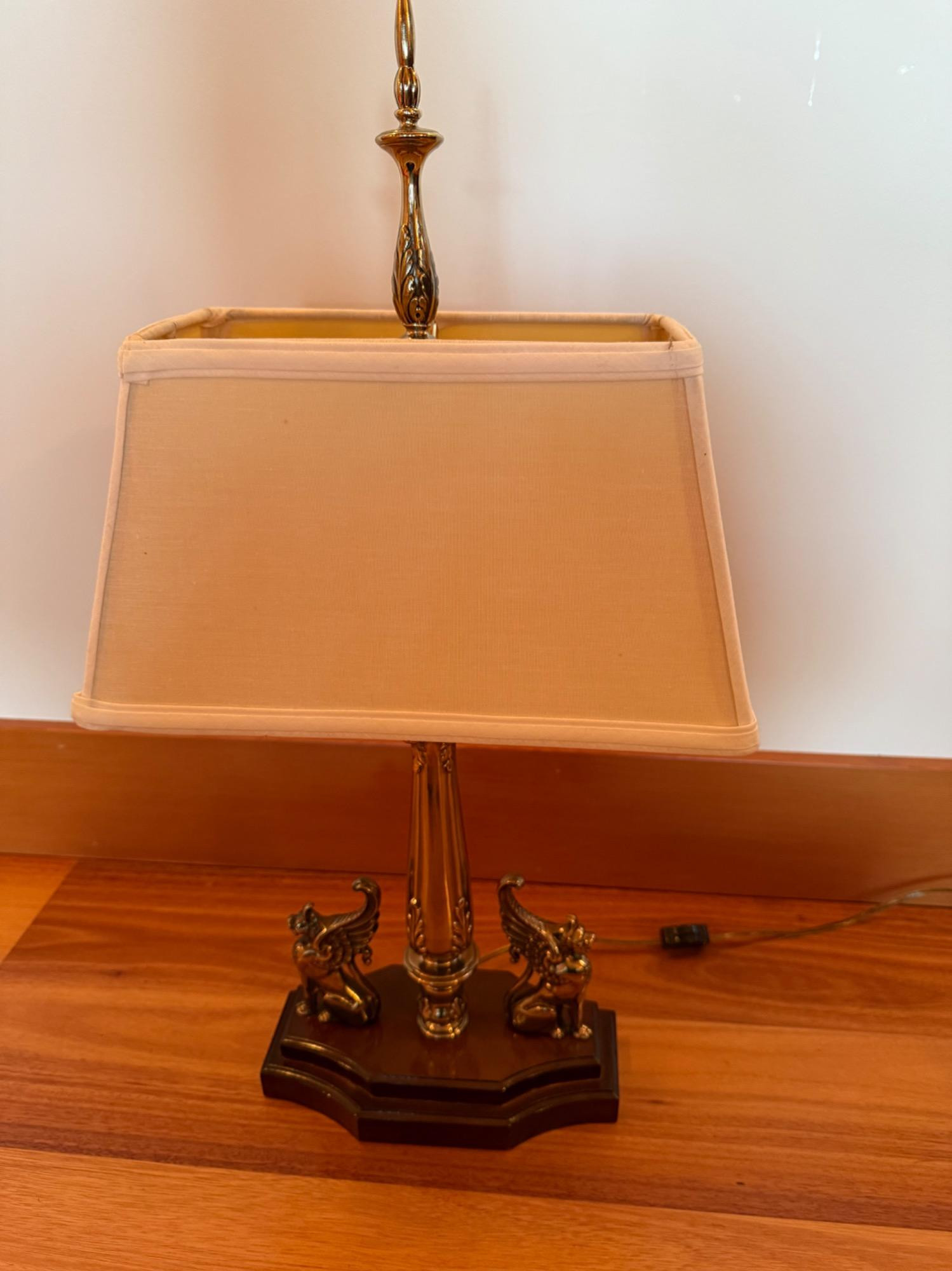 Winged Lion Brass Table Lamp – 25" Tall. Elegant vintage brass table lamp featuring a striking winged lion motif at its base. The lamp stands 25 inches tall, with a width of 13 inches and a depth of 6.5 inches. Its unique design adds a touch of sophistication and character to any space. Comes with a rectangular shade as shown.