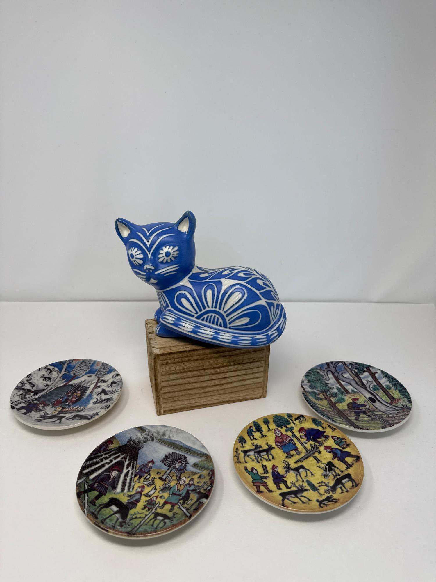 Pablo Zabal Chilean Pottery Cat & Arabia Finland Collector Plates. This lot includes a beautifully hand-painted pottery cat sculpture by Chilean artist Pablo Zabal, featuring intricate white floral patterns on a vibrant blue body. The cat is artist-signed on the bottom. Additionally, this set includes four Arabia Finland collector plates from the 1987 Lapland series by artist A. Alariesto. Each plate showcases unique, detailed artwork depicting traditional Lapp settlement and culture. The plates are numbered and marked on the back.