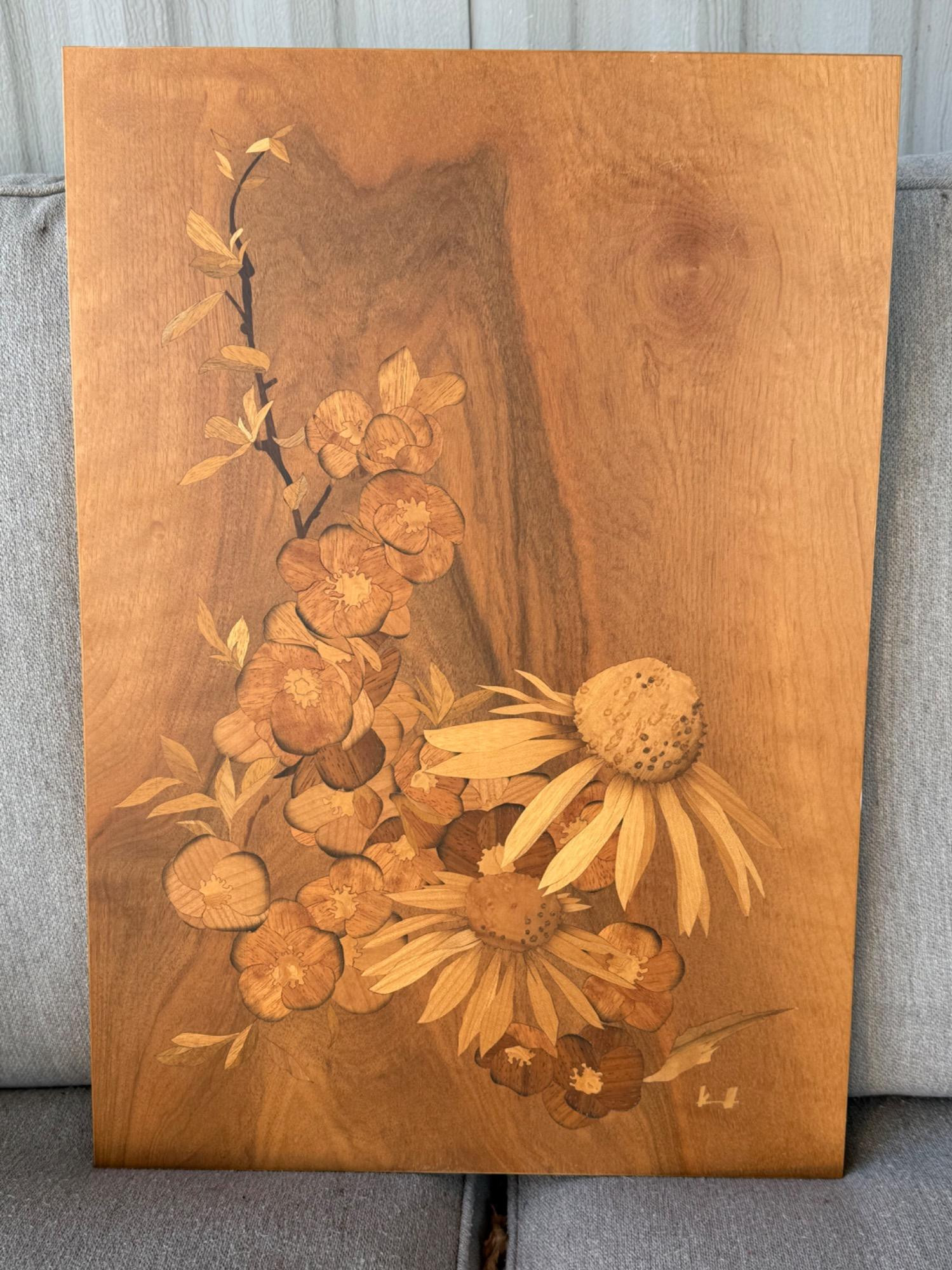 Karl Heinisch Wood Inlaid Art – Handcrafted Floral Marquetry. A stunning example of fine marquetry by Karl Heinisch, this handcrafted wood inlaid artwork showcases a beautifully detailed floral design. Crafted with precision using various wood veneers, this piece highlights natural wood tones and intricate artistry, capturing the elegance of nature with remarkable depth and texture. A timeless piece of craftsmanship, perfect for collectors of fine wood art, vintage décor, or unique wall displays.
