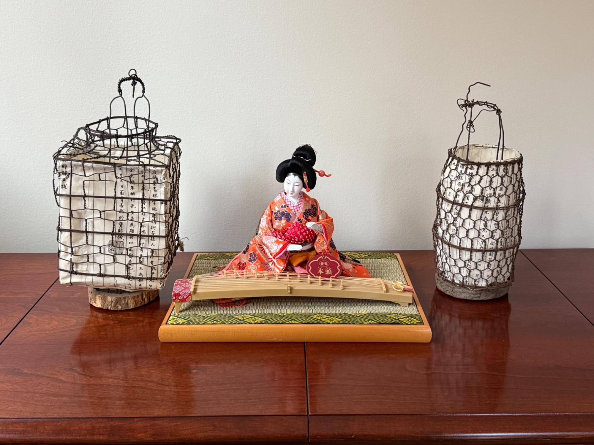 Lot # 122 - Japanese Geisha Doll w/ Koto Musical Instrument + 2 Paper Lanterns