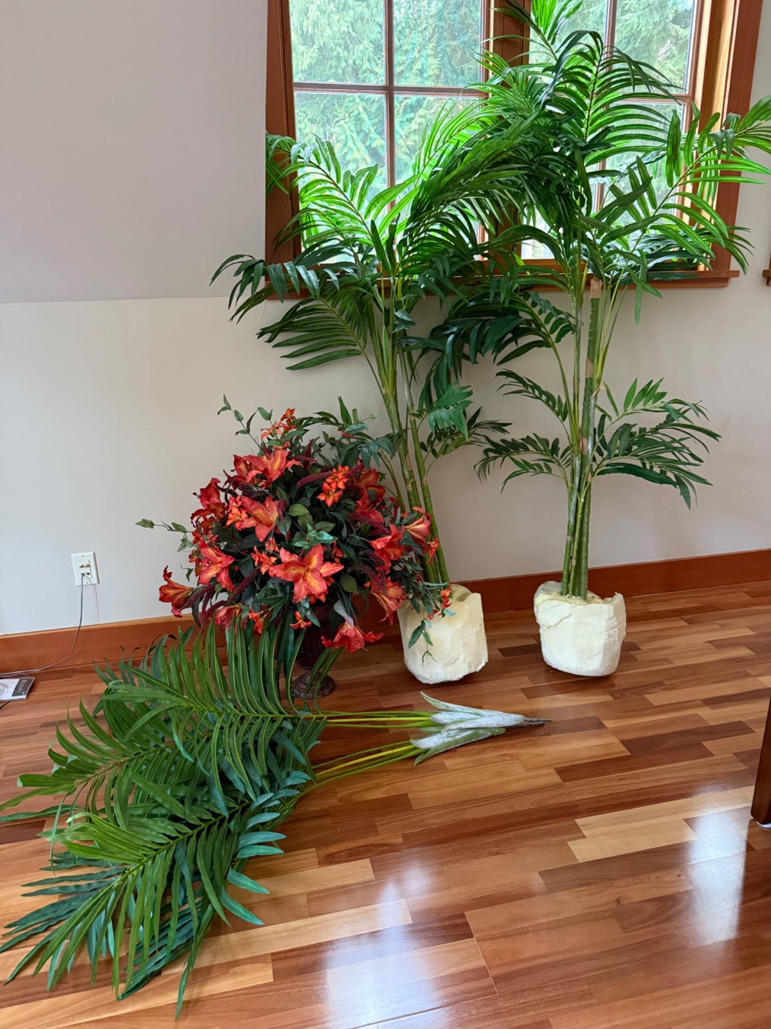 Faux Palm Trees & Lily Floral Arrangement – Lifelike Artificial Plants. This set of lifelike artificial plants includes two faux palm trees standing approximately 6 to 6.5 feet tall and a vibrant lily floral arrangement. The palms feature lush green foliage and realistic textured trunks, perfect for adding a tropical touch to any indoor space. The lily arrangement showcases rich red and orange blooms, creating a striking accent piece. Faux palm trees, approximately 6-6.5 ft tall. Perfect for home decor, office spaces, event decorations, or indoor gardens, these low-maintenance artificial plants bring a fresh and lively aesthetic without the need for watering or upkeep.