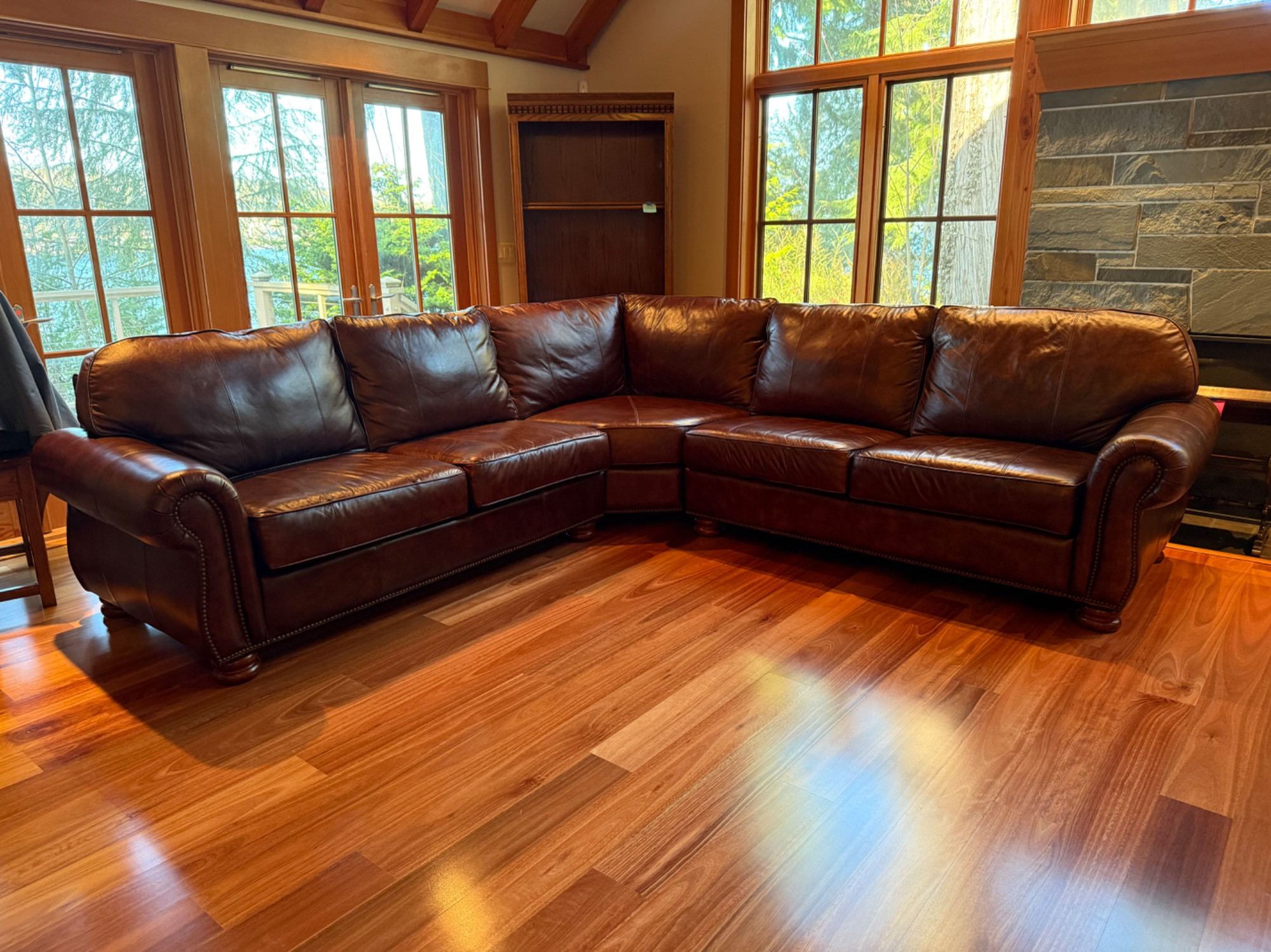 Thomasville Leather Sectional Sofa – Rich Brown. Upgrade your living space with this luxurious Thomasville leather sectional sofa, combining classic elegance with ultimate comfort. Crafted from high-quality brown leather, this sectional features plush, well-padded cushions and beautiful rolled arms with nailhead trim, adding a sophisticated touch to any home. Brand: Thomasville – Known for premium craftsmanship Material: Genuine leather in a rich brown tone Size: 8’2” from each end to the center bend. Back side is 9’4” from arm the middle. Each piece is the same length Condition: Clean and well-maintained, no tears or damage Design Features: Rolled arms, nailhead trim, deep seating for superior comfort Bidding on this lot is an agreement that: (1.) You will have at least 2 capable, able-bodied persons to lift and load at a minimum. (2.) You will bring a hand truck and/or any other tools needed to remove this item. If these steps are not followed your item will be forfeited and no refund given.