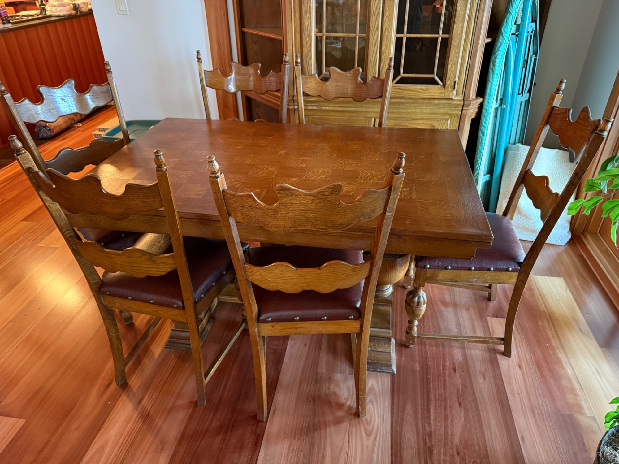 Oak Dining Set w/ Parquet Top Table & Carved Ladder-Back Chairs. This elegant vintage oak dining set features a stunning parquet wood tabletop, showcasing a checkerboard-style grain pattern that adds depth and character. The set includes six beautifully carved ladder-back chairs, each with scalloped detailing and upholstered seats for added comfort. The sturdy pedestal base enhances the table’s durability while complementing its classic design. This timeless piece is perfect for family gatherings, dinner parties, or as a standout addition to your dining space. Table is 30” H x 60” W x 23” D Bidding on this lot is an agreement that: (1.) You will have at least 2 capable, able-bodied persons to lift and load at a minimum. (2.) You will bring a hand truck and/or any other tools needed to remove this item. If these steps are not followed your item will be forfeited and no refund given.