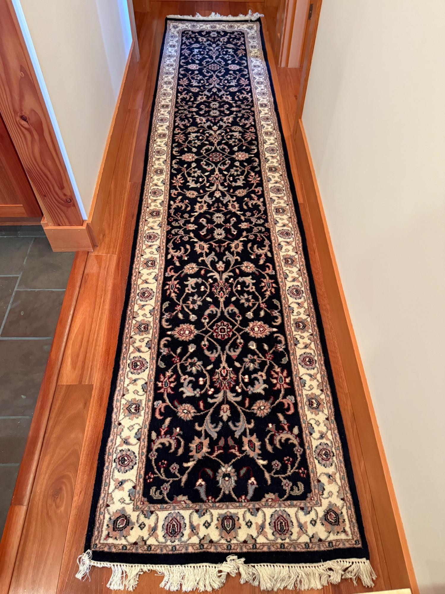 Elegant 12 ft Black Wool Runner – Traditional Floral Design. This stunning black wool runner features a classic floral motif with intricate detailing and a cream border. Measuring 12 feet long by 31 inches wide, it’s the perfect addition to a hallway, entryway, or living space, adding warmth and sophistication. Hand-knotted or machine-made (confirm details), this rug boasts high-quality craftsmanship with fringed edges for a refined touch.