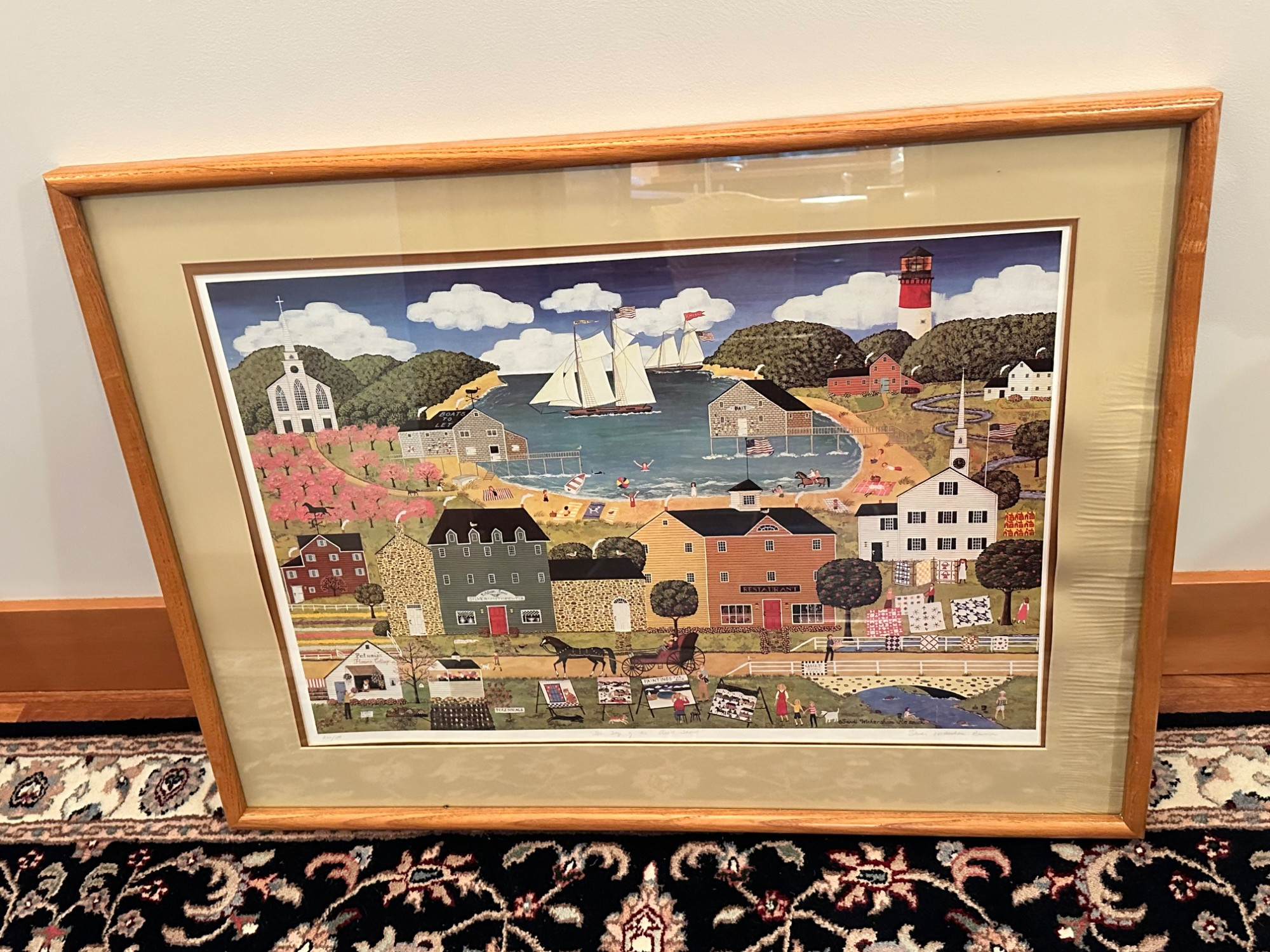 "Day of the Quilt Show" Framed Print Signed by Sandi Wickersham Resnick. This charming limited-edition print by Sandi Wickersham Resnick beautifully captures the essence of a quilt show day in a vibrant small-town setting. The scene is rich with historical architecture, local traditions, and intricate quilt displays, celebrating the artistry of quilting and the sense of community it brings. Resnick’s signature folk art style brings warmth and nostalgia, depicting a lively waterfront town where people gather to admire handcrafted quilts, enjoy the festivities, and embrace a timeless tradition. Hand-signed and numbered (260/500), this piece is a must-have for folk art enthusiasts, quilt lovers, and collectors alike. 26 x 35