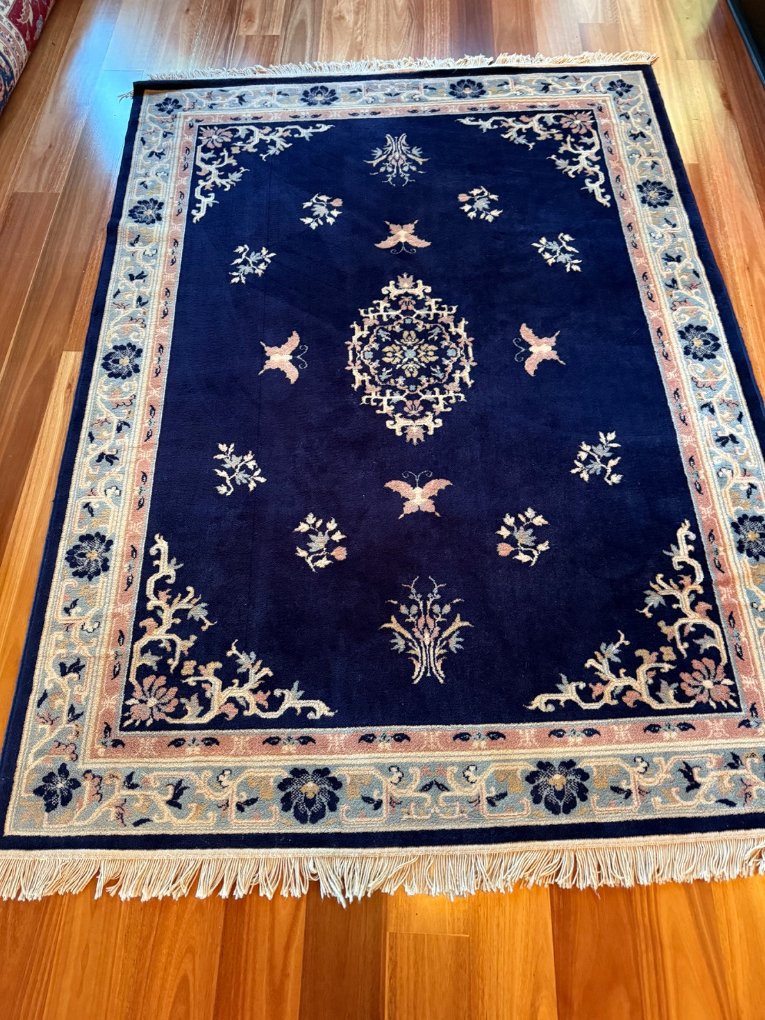 Nepal Blue Wool Rug – Intricate floral & Medallion Motifs – 5'7" x 8' This beautiful navy blue wool rug, made in the USA, features an elegant Oriental design with intricate floral and medallion motifs. Crafted from a pure wool pile, it offers durability, warmth, and a plush texture underfoot. The rug includes fringed edges, adding a classic finishing touch. The "Woolmark" label ensures high-quality craftsmanship. Dry clean only. A timeless addition to any space!
