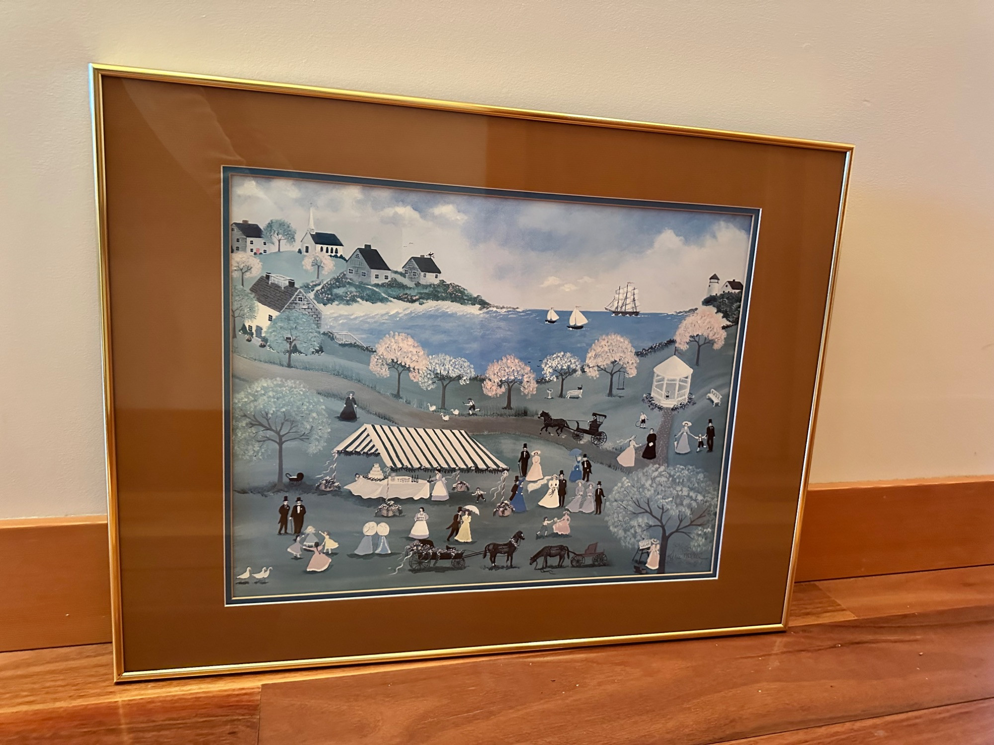 Karri McCue Limited Edition "Seaside Wedding" Framed Print. This limited edition print, titled "Seaside Wedding," is a beautiful offset lithograph of an original painting by Karri McCue. Featuring a tranquil coastal wedding scene, the artwork exudes a charming folk-art and Americana style, with elegantly dressed figures, blossoming trees, and a peaceful ocean backdrop. This is a certified limited edition print, authenticated by McCue Publications (1987). Dimensions: 28.75” L x 22” T