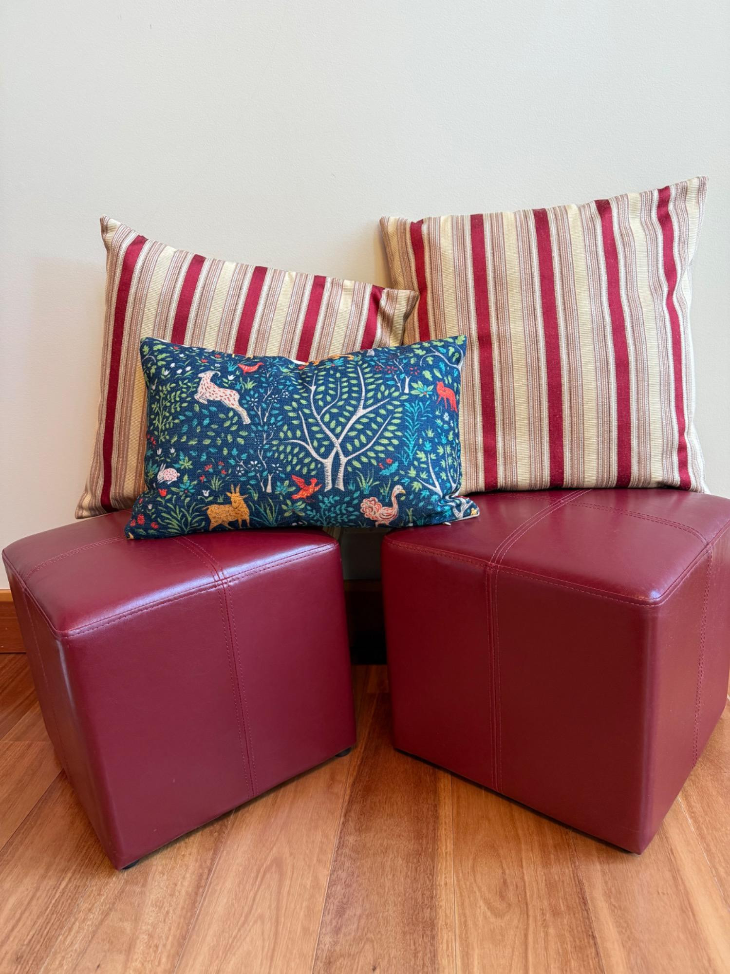 Set of Two Cube-Style Burgundy Faux Leather Ottomans + Pillows. Enhance your living space with this set of two cube-style burgundy faux leather ottomans. Measuring 14" x 14" x 13" tall, these modern and functional pieces are perfect as extra seating, footrests, or accent tables. The sleek cube design offers a contemporary touch, while the rich burgundy faux leather upholstery adds a touch of elegance. Bidding on this lot is an agreement that: (1.) You will have at least 2 capable, able-bodied persons to lift and load at a minimum. (2.) You will bring a hand truck and/or any other tools needed to remove this item. If these steps are not followed your item will be forfeited and no refund given.